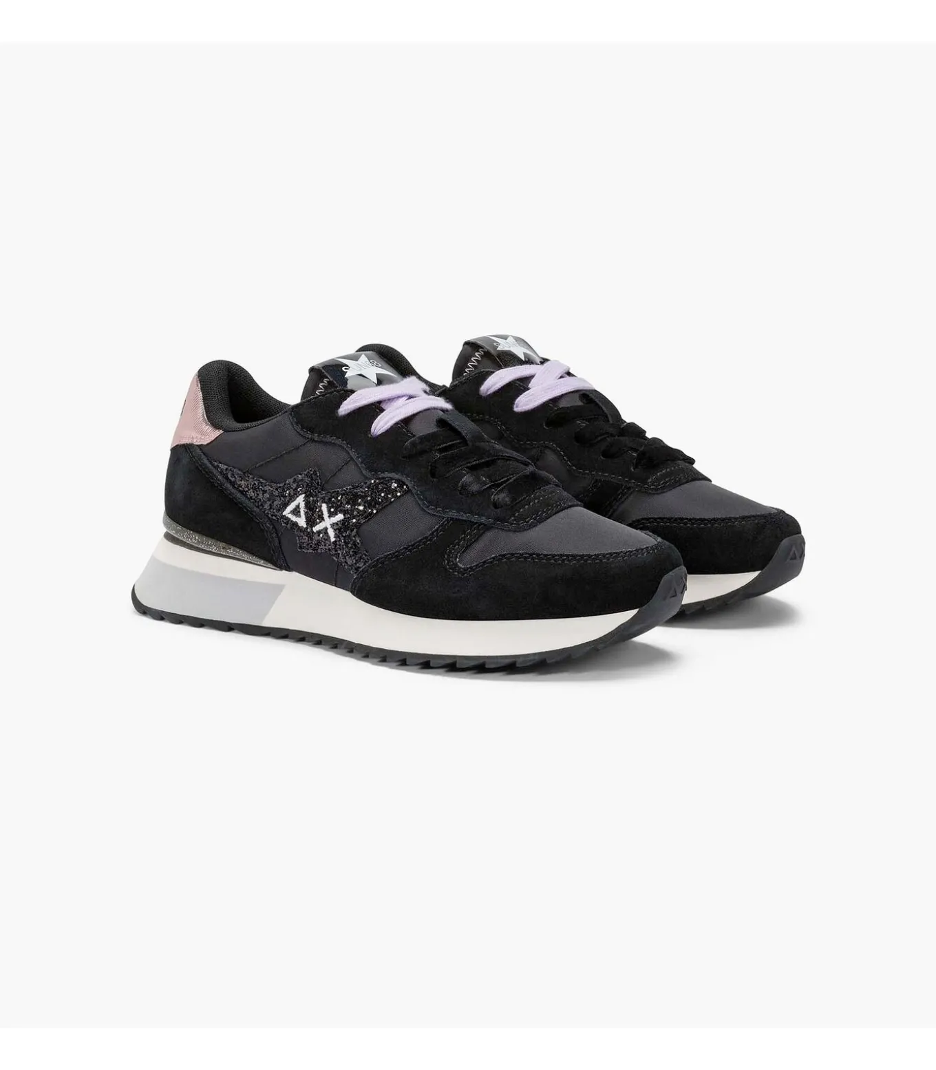 Kleur: zwart. Samenstelling: 49% leer, 41% stof, 10% polyurethaan. Sluiting: fluwelen veters. Binnenvoering: micromesh voering. Zool: gefreesd EVA met rubberen zool. Details: Stargirl Glitter damessneaker met nylon en suède bovenkant, verrijkt met een glitterpatch met geborduurd logo en een achterspoiler met slangenmotief. Het sterrenlabel op de tong en de gelamineerde details maken het vrouwelijke en glanzende design compleet. Gebruik: perfect om een vleugje glamour toe te voegen aan dagelijkse outfits, ideaal in de stad met jeans, rokken of casual jurken.