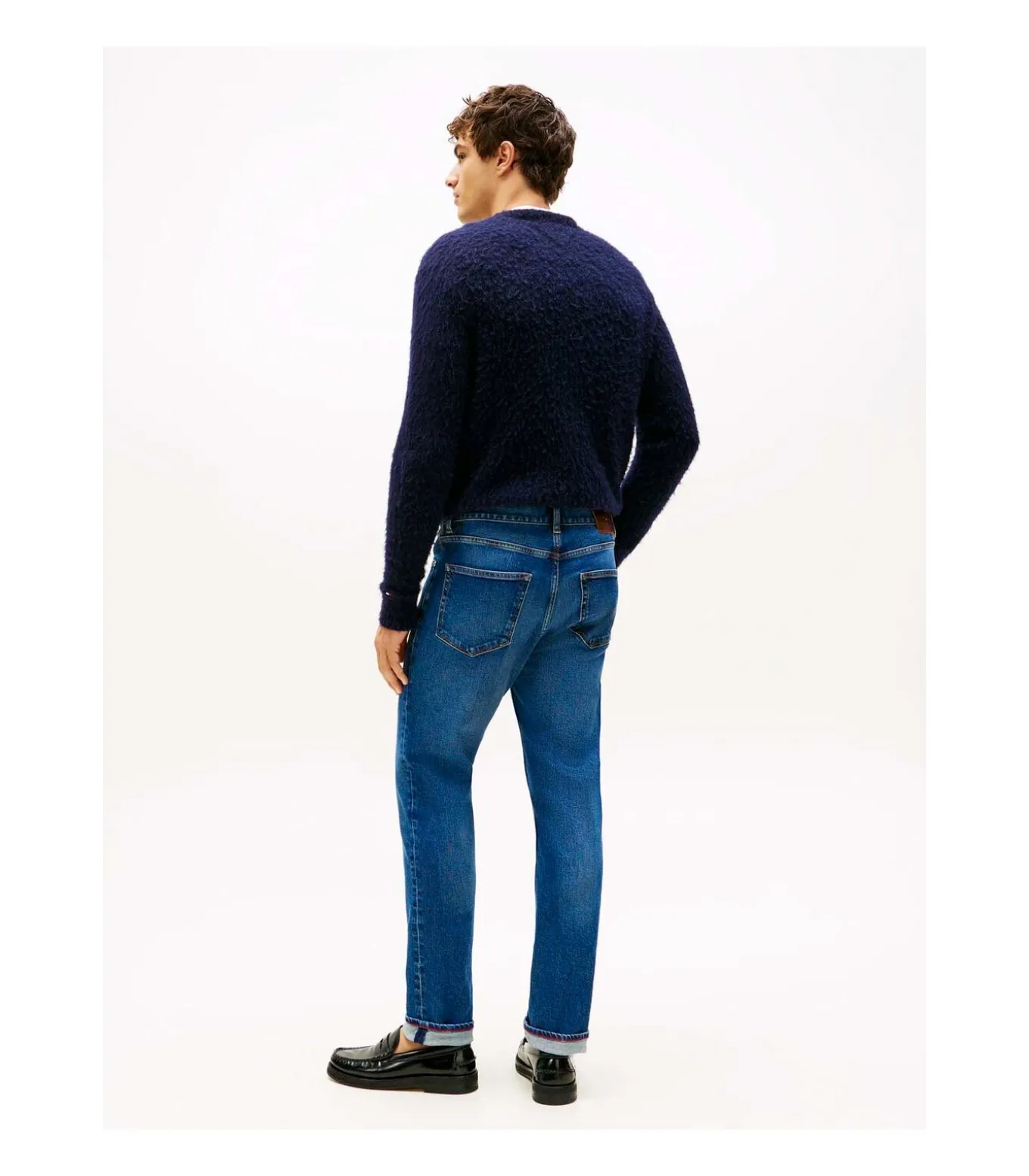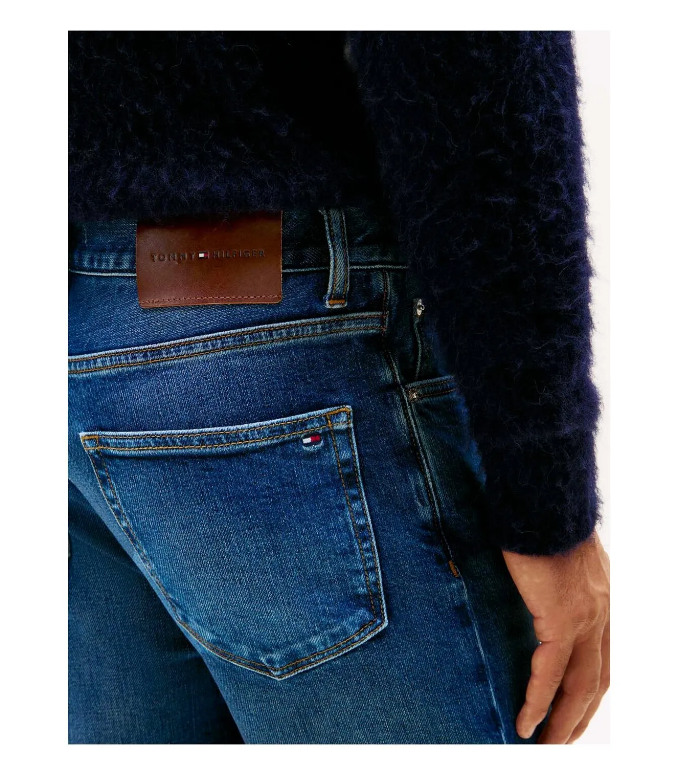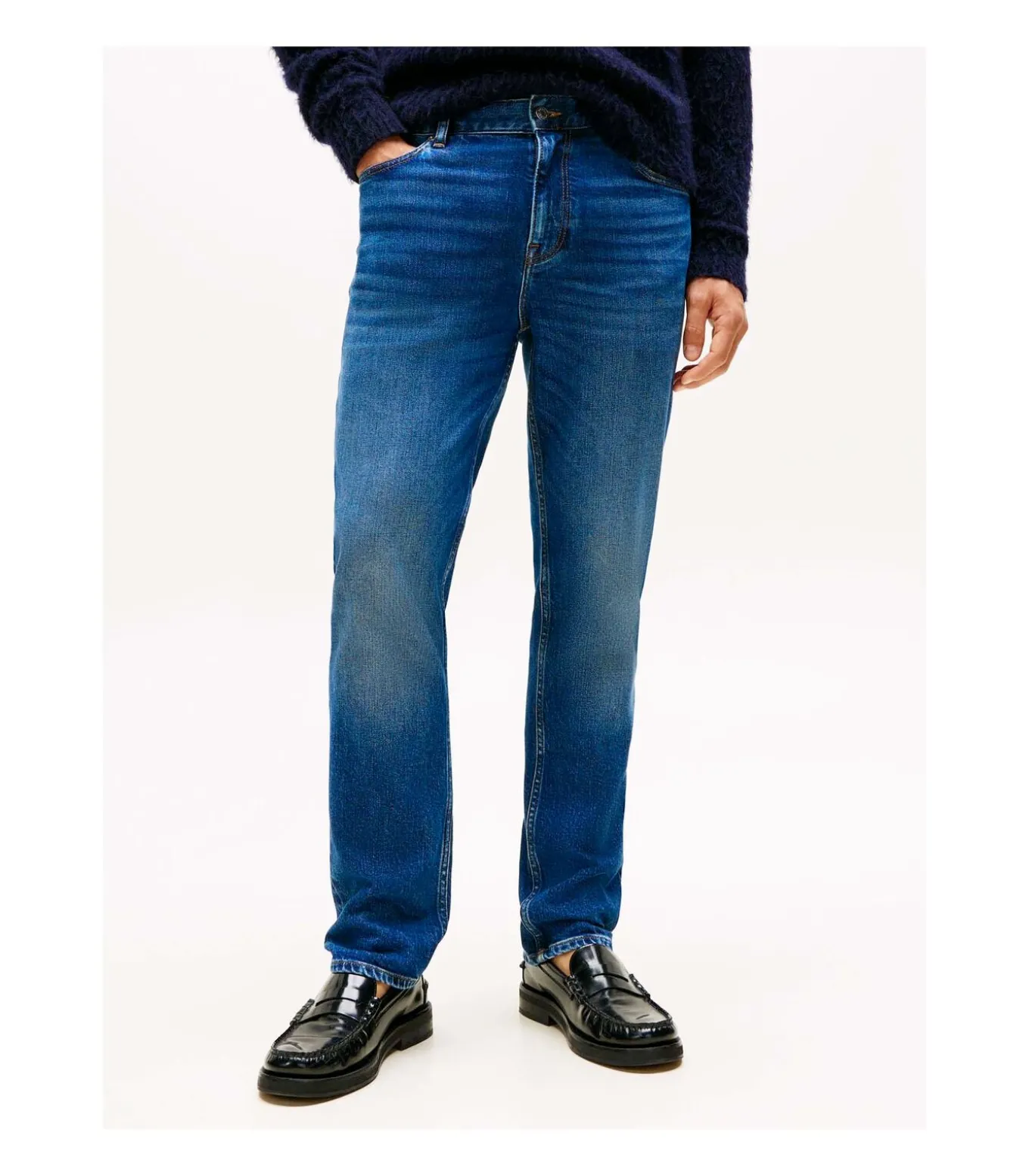 Kleur: James Blue. Samenstelling: 99% katoen, 1% elastaan. Pasvorm: Recht model. Details: Stretchkatoenen denim met kreukeffect en vervaging aan de voor– en achterkant, five–pocketmodel, signature tape op het muntzakje, Tommy Hilfiger–vlag geborduurd op de achterzak. Duurzaamheid: Gemaakt van gecertificeerd gerecycled katoen. Gebruik: Ideaal voor praktische en veelzijdige kleding, perfect voor vrije tijd en casual weekendlooks.