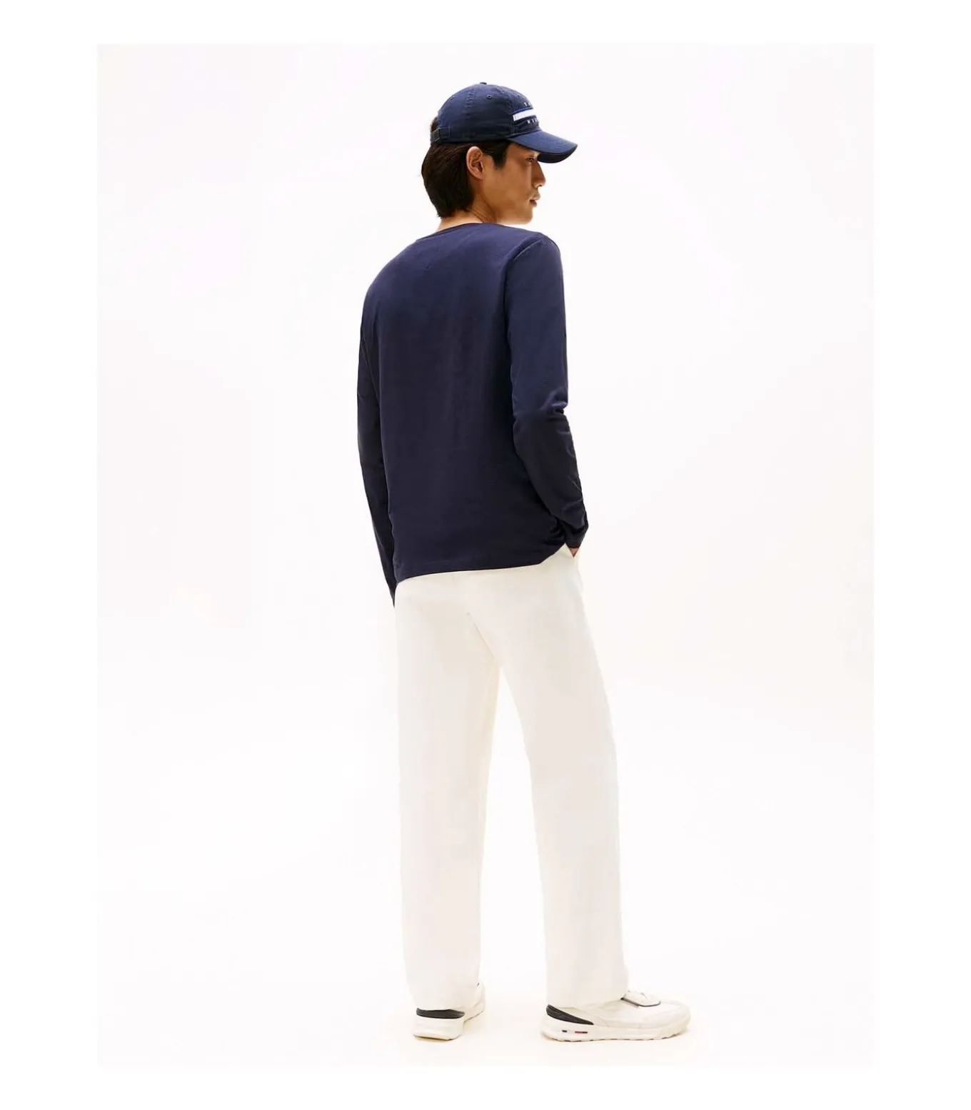 Kleur: marineblauw. Samenstelling: 96% katoen, 4% elastaan. Mouwen: lang. Halslijn: ronde hals. Pasvorm: slim fit. Details: stretchkatoenen jersey met kenmerkend lint in de nek, geborduurde Tommy Hilfiger–vlag op de borst. Duurzaamheid: gemaakt van biologisch gecertificeerd katoen in transitie. Gebruik: perfect als praktisch en veelzijdig basiskledingstuk, geschikt voor casual looks of als laagje onder jassen en truien.