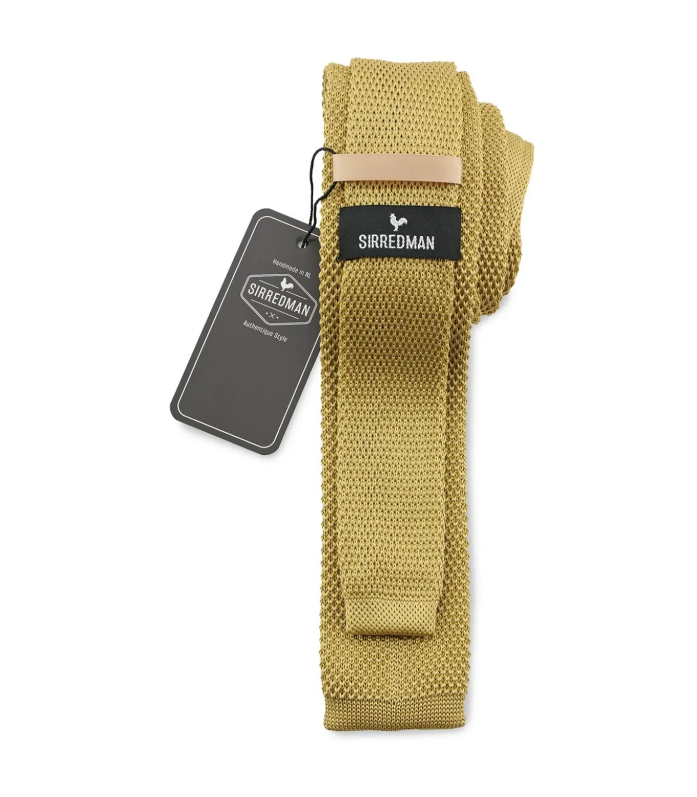 Deze gebreide stropdas is recht afgewerkt in plaats van in een punt zoals bij traditionele stropdassen.