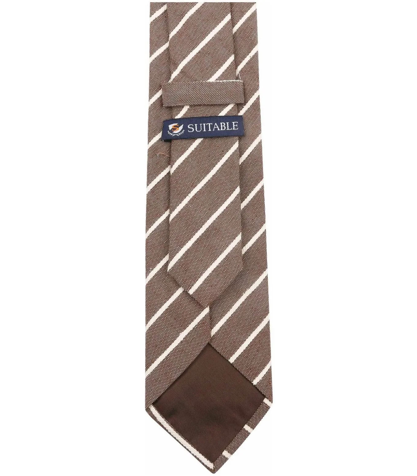 Geef een zakelijke touch aan je outfit door middel van deze stijlvolle stropdas van Suitable. De Suitable stropdas heeft een bruine kleur met een strependessin. De das is gemaakt van een linnen en zijdemix en heeft hierdoor een luxe uitstraling.Bruine kleurGemaakt van een mix van zijde en linnenBreedte 7,5 cm (breedste punt)