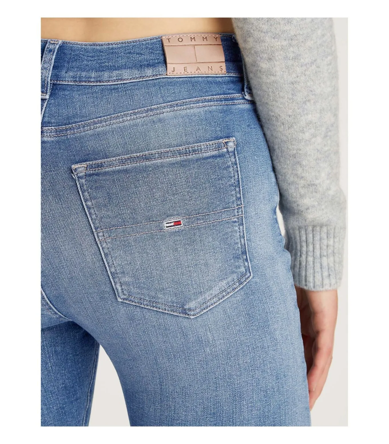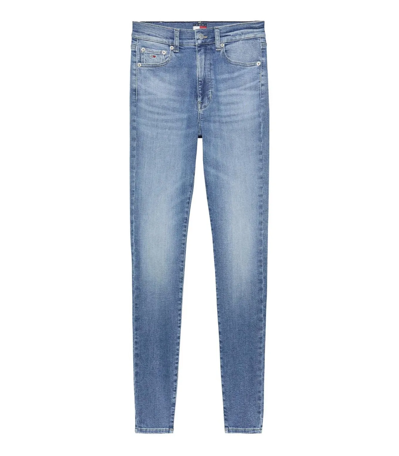 * Kleur: Denim Medium * Lengte: Normaal * Pasvorm: Skinny fit * Sluiting: Rits en knoop * Details: Vervaging aan de voor– en achterkant, kreuken op de dijen, Tommy Jeans–vlagpatch op muntzakje en achterzak * Gebruik: Perfect voor een casual look maar elegante outfits, gecombineerd met enkellaarsjes of sneakers voor een veelzijdige en moderne look.