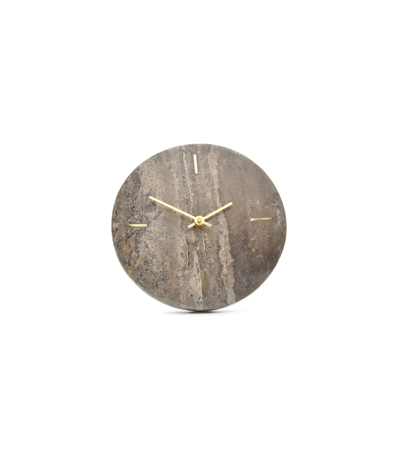De nieuwe varianten van de Zone collectie zorgen ervoor dat we de tijd nooit meer uit het oog zullen verliezen. Voor deze variant stopten we de klassieke tafelklok in een modern jasje door gebruik te maken van travertijn. De combinatie met de gouden wijzers zorgt voor een fris geheel wat perfect staat in elk interieur. Ontdek hier hoe u de klok kan herstellen als het uurwijzer los zit.