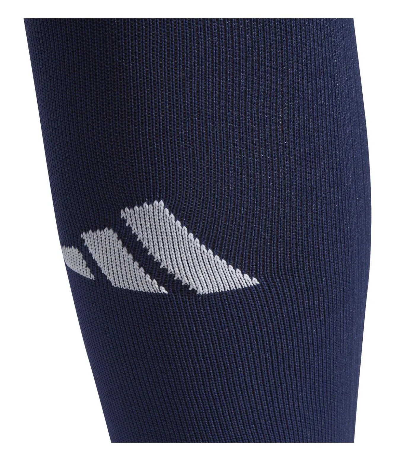 * Kleur: Blauw/Wit * Samenstelling: 96% gerecycled polyester, 4% elastaan * Details: Iconisch driestrependesign op de bovenrand, Adidas–logo aan de zijkant, stretchconstructie voor een nauwsluitende pasvorm over de scheenbeschermers * Duurzaamheid: Gemaakt van minimaal 40% gerecyclede materialen om plasticvervuiling te verminderen * Gebruik: Ideaal voor voetballen of trainen, het zorgt voor comfort en ademend vermogen dankzij AEROREADY–technologie
