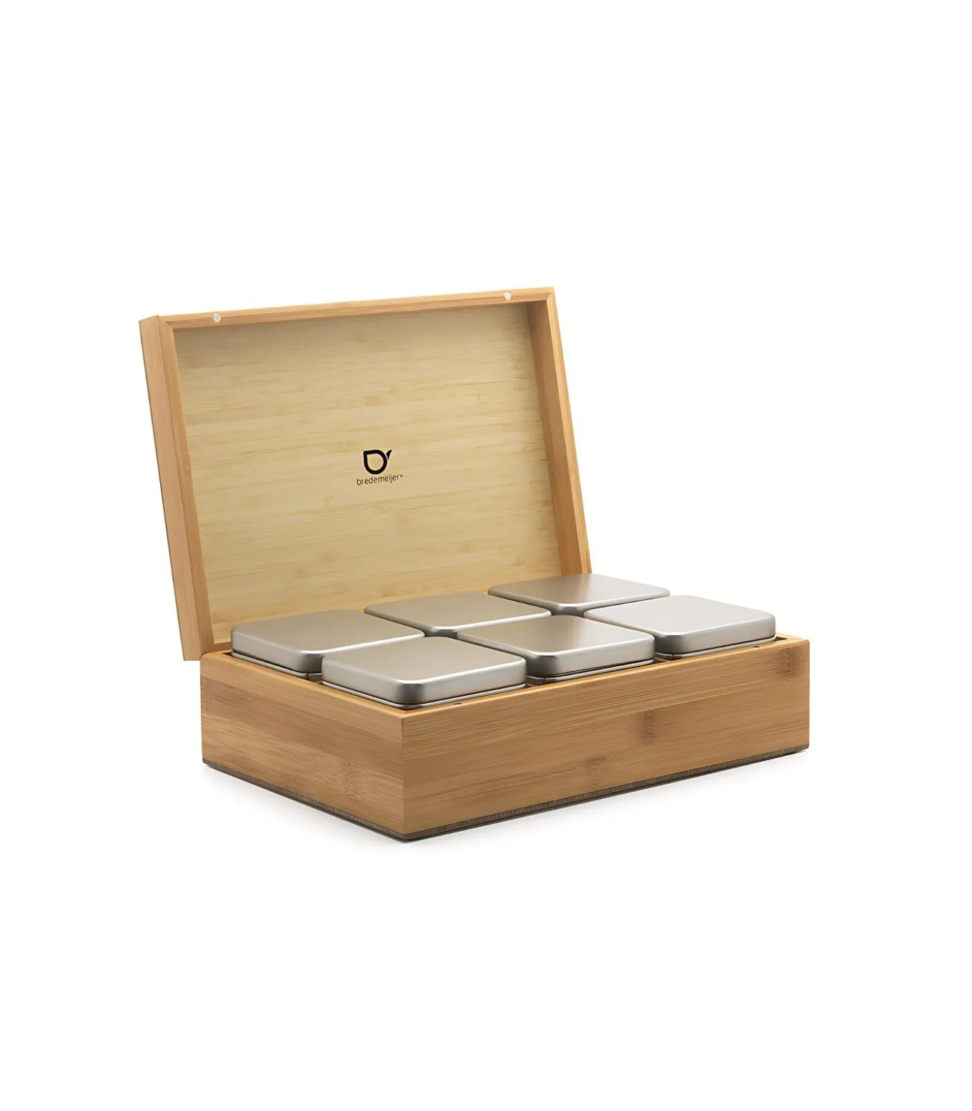 Theedoos voorzien van 6 blikjes. Speciaal ontwikkeld voor het bewaren van losse thee. Een musthave voor de echte theeliefhebber!