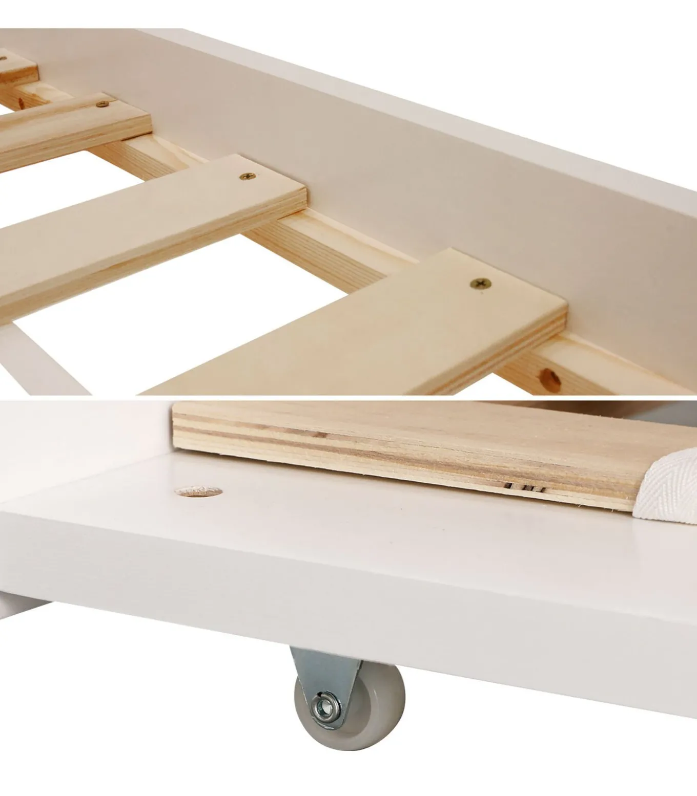 Dit ladebed is een praktische aanvulling op het slaapkamermeubilair van uw kind. Ontworpen in de vorm van een lade, kunt u in een handomdraai een extra bed toevoegen voor een tweede kind. Dit extra bed op wieltjes is zeer gemakkelijk te hanteren en glijdt overdag moeiteloos onder een bed, waardoor ruimte in de kamer wordt bespaard. Dit moderne witte meubel, gemaakt van grenenhout, is ideaal als aanvulling op het bed MARCEAU.