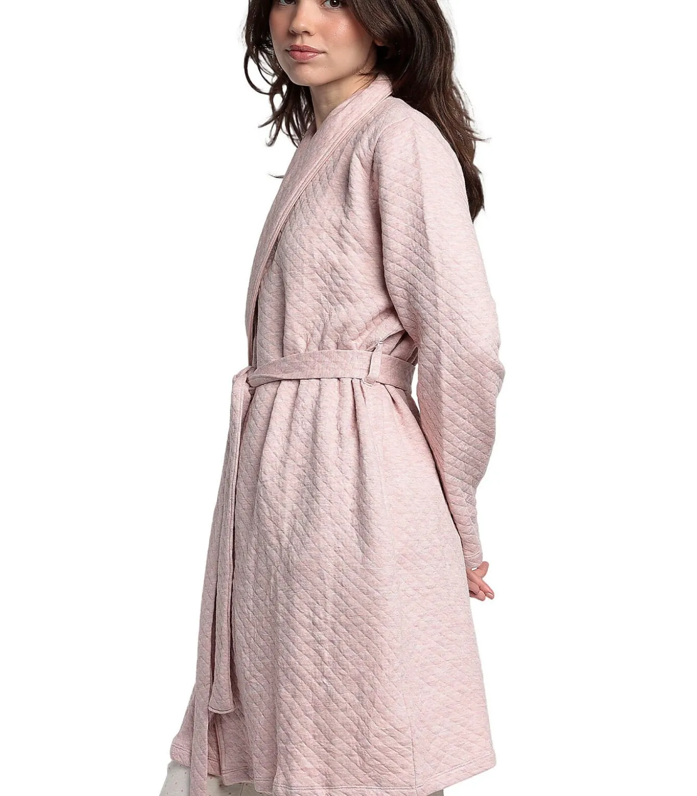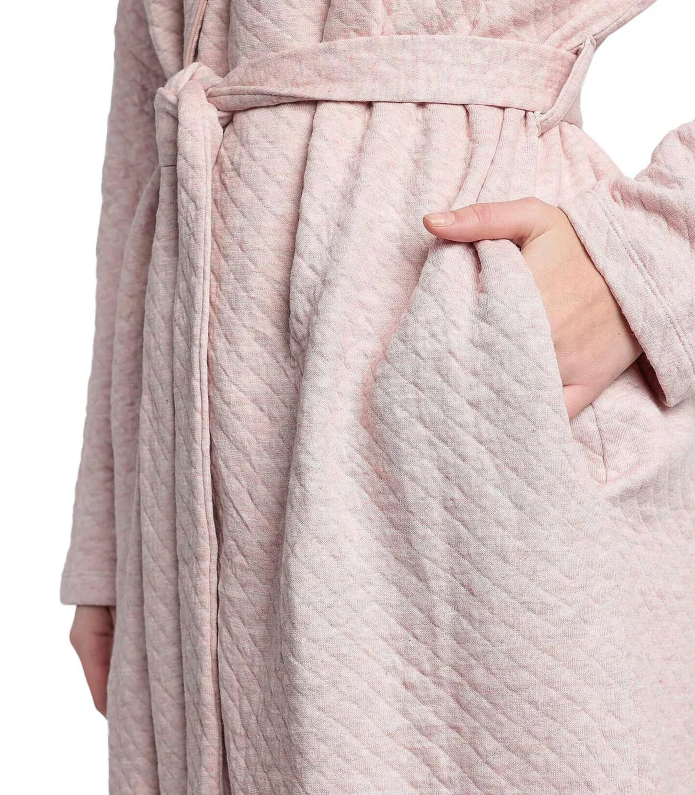 Een knusse, vrouwelijke en elegante badjas voor ontspannen momenten thuis. Het heeft lange mouwen en een brede, zachte sjaalkraag voor een vleugje verfijning. Strikceintuur in de taille om naar wens aan te passen. Half katoen, half viscose gewatteerde stof met honingraateffect die reliëf geeft met behoud van soepelheid en comfort, een combinatie van warmte en ademend vermogen. De delicate, rustgevende kleur is perfect voor een cocooning, vrouwelijke look. Twee praktische, discrete zijzakken. Ideaal voor winterochtenden, ontspannen avonden of om gewoon aan te trekken als je opstaat. Zachte, sobere en verfijnde look, ideaal voor vrouwen die op zoek zijn naar een lichte maar omhullende badjas. Geleverd in een Admas doos.[Badjas wordt apart verkocht. Pyjama’s en andere accessoires die het model op de foto’s draagt, zijn niet inbegrepen].
