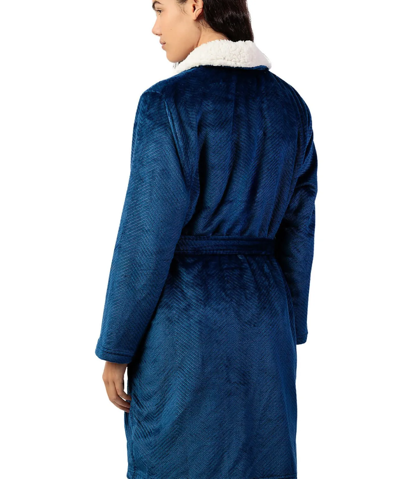 Deze badjas is de perfecte manier om te ontspannen in de warmte van de winter en tegelijkertijd stijlvol thuis te blijven. Recht en comfortabel, gemaakt van ultrazacht Corel veloursfleece met visgraatmotief in reliëf. De lange mouwen en sherpa voering bij de kraag zorgen voor warmte en zachtheid. Hij kan worden vastgemaakt met knopen aan de voorkant voor extra steun, en met een bandje die in de taille kan worden vastgemaakt. Het heeft twee discrete, praktische zijzakken. Het is vrouwelijk, knus en verfijnd, perfect om te combineren met je favoriete pyjama voor een harmonieuze, cocooning look. Geleverd in een Admas doos.[Jurk wordt apart verkocht. De pyjama en andere accessoires die het model op de foto’s draagt, zijn niet inbegrepen].