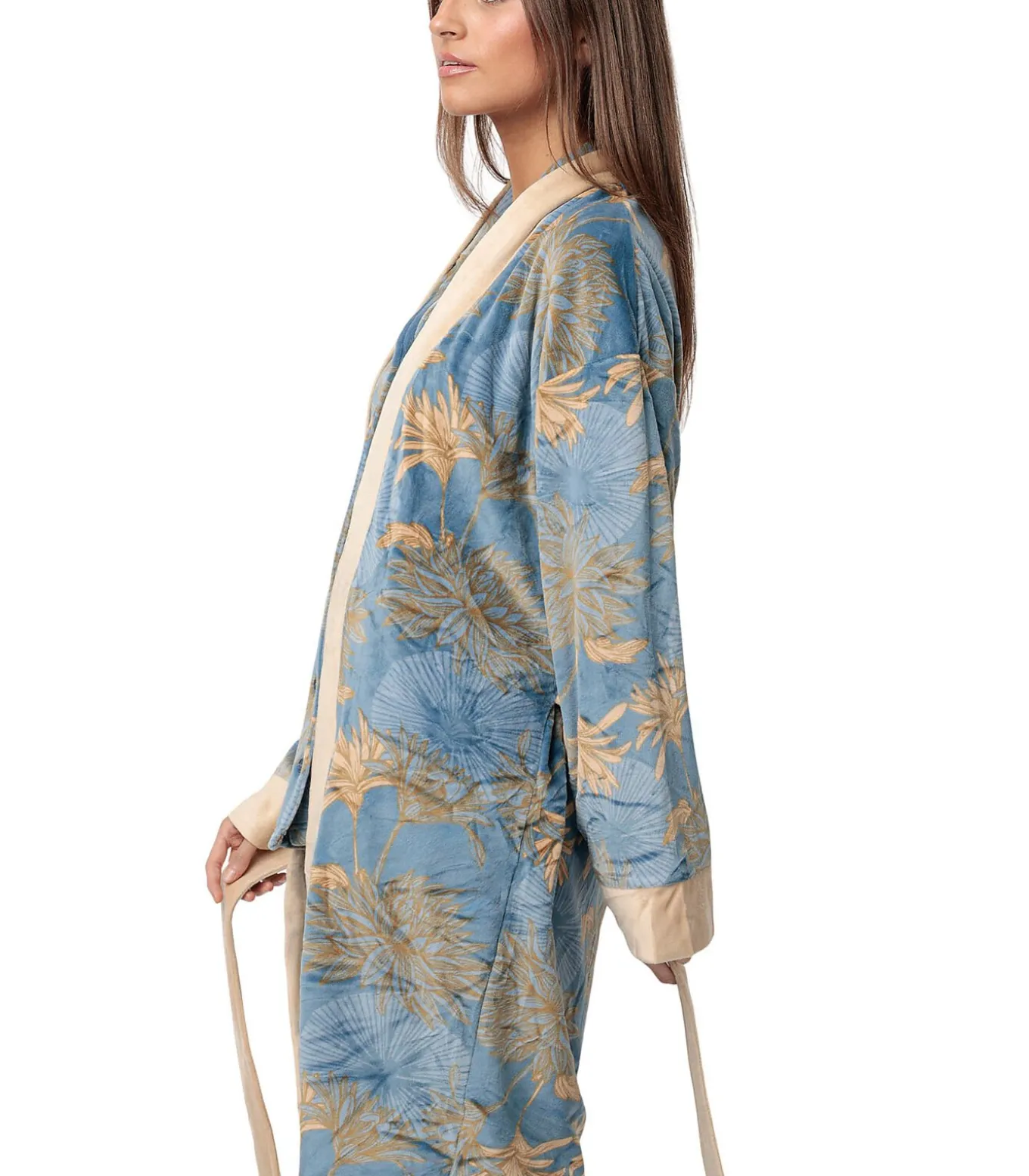 Een ruimvallende badjas met een elegante, nonchalante look, voorzien van een bloemmotief in goudbeige tinten op een zachtblauwe achtergrond. Tropische bloemen en gebladerte bedekken de hele stof, waardoor een stijl ontstaat die zowel natuurlijk als verfijnd is. De randen van de badjas, manchetten en tailleband zijn gemaakt van een contrasterende effen lichtbeige stof, wat zorgt voor een visueel evenwicht en een vleugje verfijning. Speciale dubbelzijdige fluwelen stof, ultrazacht, vloeiend en comfortabel. Perfect om thuis in te ontspannen en toch chique te blijven. Geleverd in een Admas Luxe doos.[Badjas wordt apart verkocht. De pyjama en andere accessoires die het model op de foto’s draagt, zijn niet inbegrepen].
