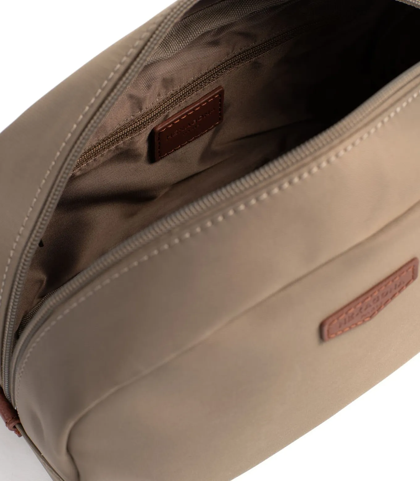 Interieur: 1 hoofdvak met 1 plat vak met ritssluiting. 2 platte zakken.