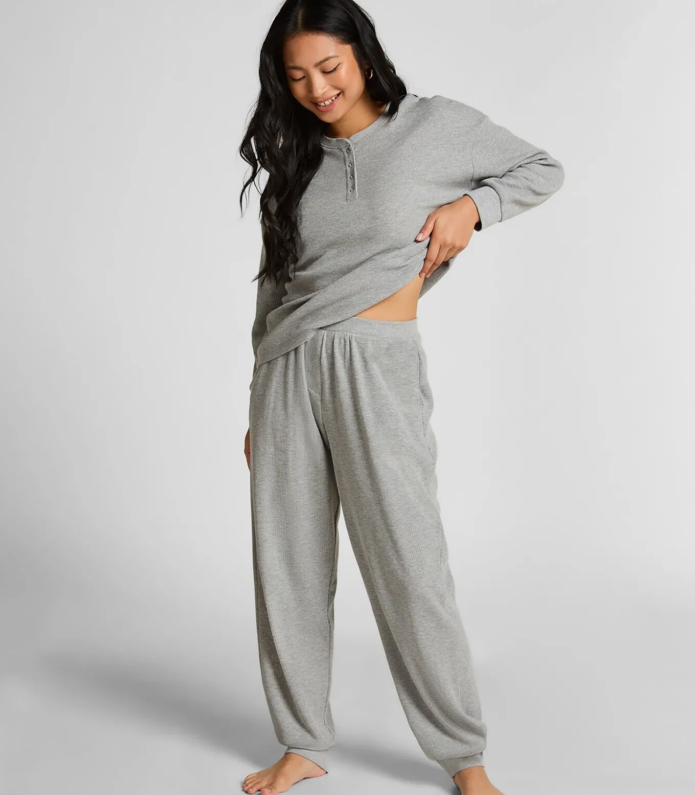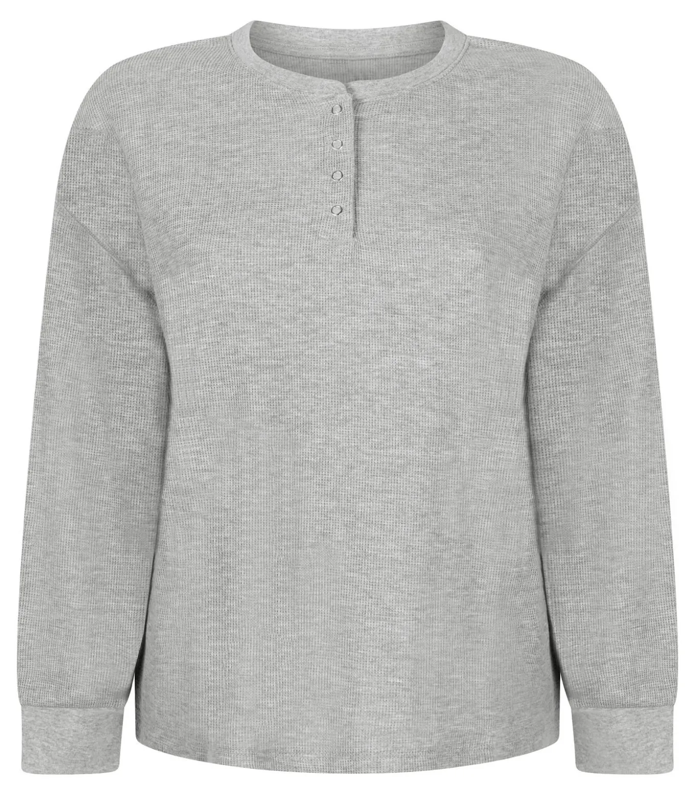 Deze warme top biedt de perfecte combinatie van comfort en casual cool. Het heeft een klassieke ronde hals, lange mouwen en een halve knoopsluiting aan de voorkant. Het is een gemakkelijk item dat textuur en warmte aan je outfits toevoegt. Ideaal om thuis in te loungen. Combineer hem met de bijpassende broek voor een complete look.