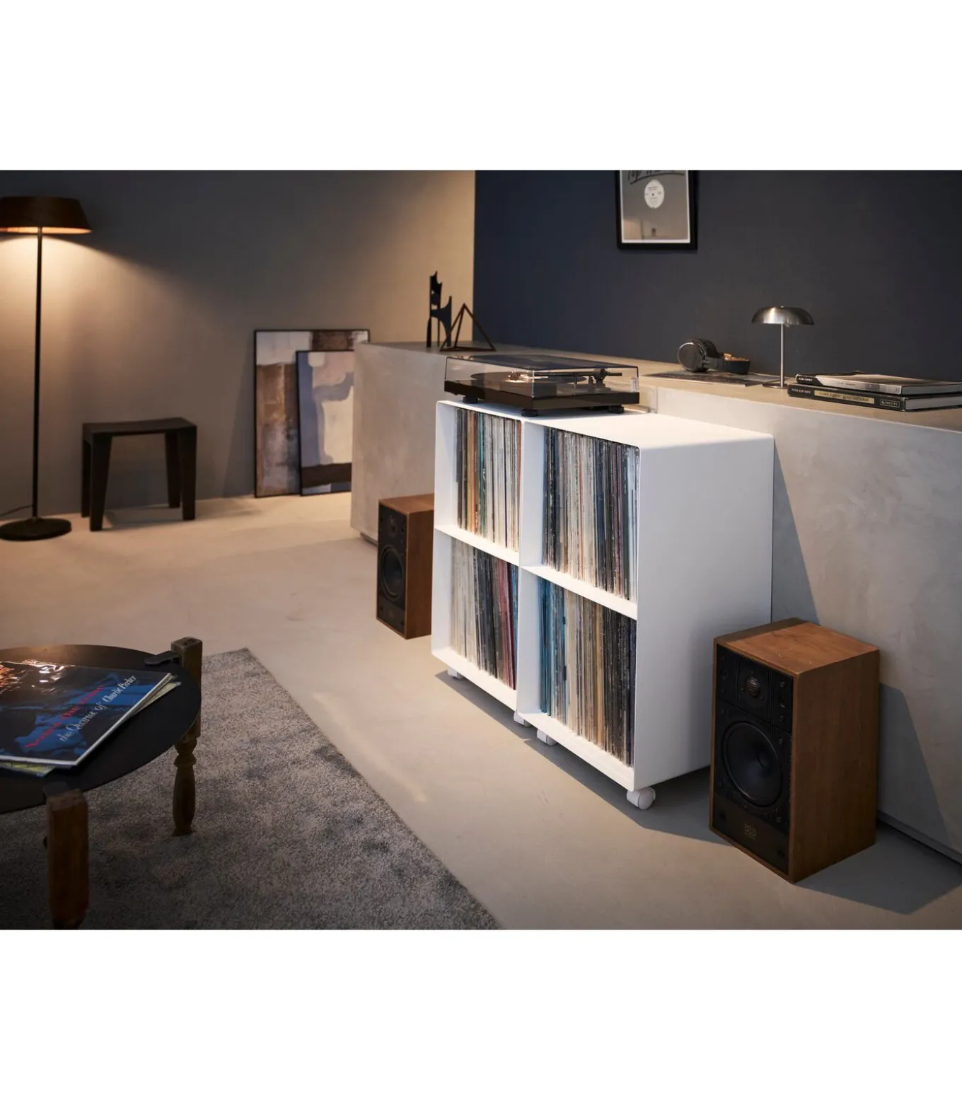 Deze platenkast van Yamazaki biedt ruime opbergruimte voor je favoriete vinylplaten. Het bovenblad is geschikt voor het plaatsen van een platenspeler, zodat je direct kunt genieten van je muziek. Dankzij de wieltjes aan de onderzijde is de kast eenvoudig te verplaatsen, wat extra flexibiliteit biedt in je interieur.