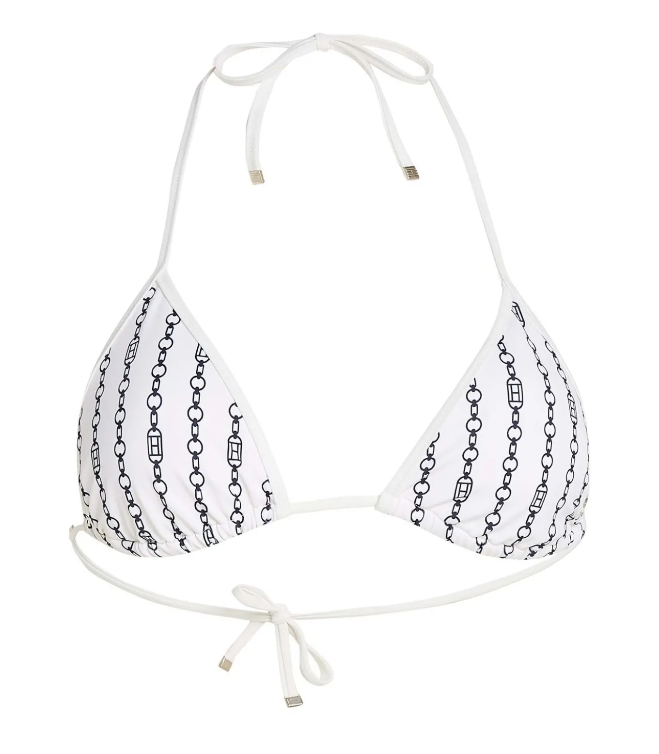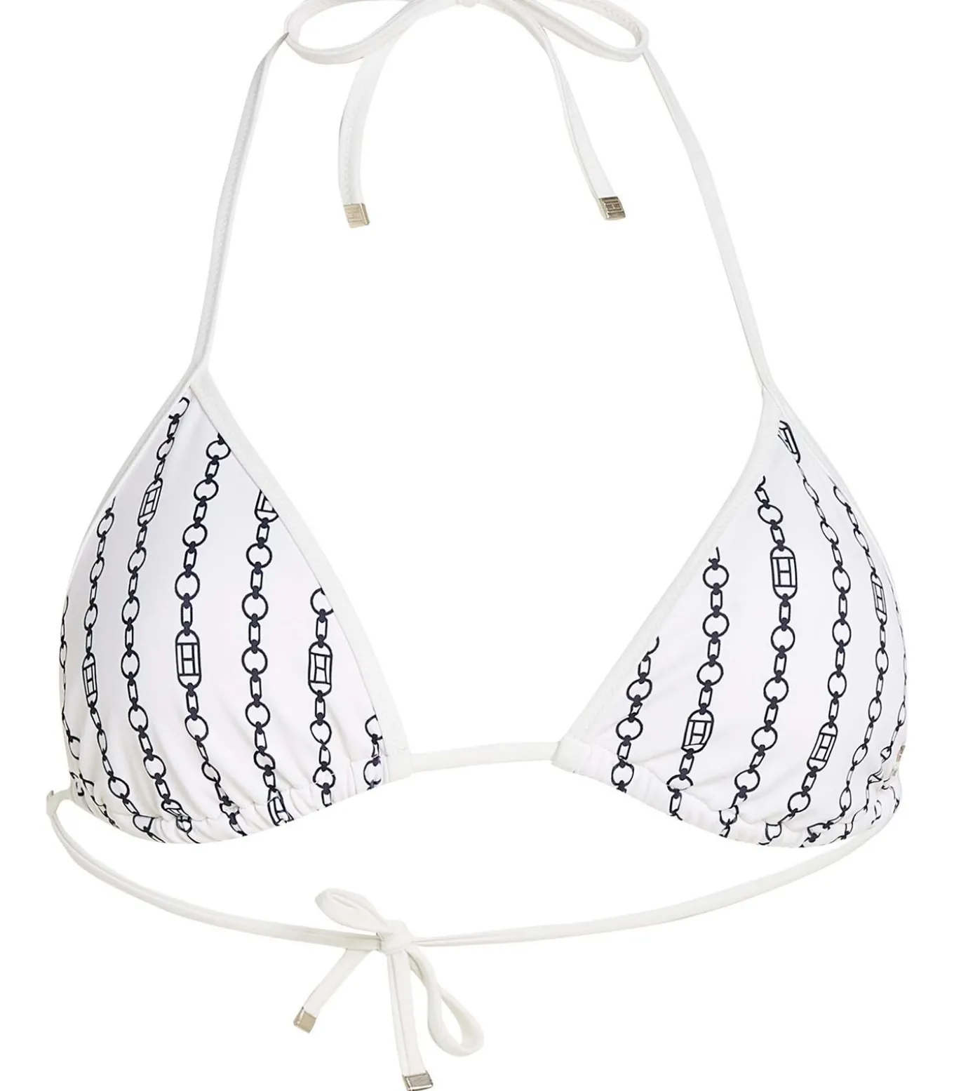 Kleur: Flag Chain Ivory Silk Samenstelling: 80% nylon, 20% elastaan Sluiting: Veters Details: Triangelbikinitop van technische stretchstof met all–over print, uitneembare vulling en dunne strikbandjes om in de nek en op de rug te strikken. Afgewerkt met een TH–monogramplaatje en Tommy Hilfiger–merk voor een onderscheidende en verfijnde touch Duurzaamheid: Gemaakt van gecertificeerd gerecycled nylon, verkregen uit de recycling van visnetten, tapijten en afgedankte stoffen, om de impact op het milieu te verminderen Gebruik: Perfect voor een elegante en verfijnde stijl op het strand of bij het zwembad, met een grafische touch die niet onopgemerkt blijft