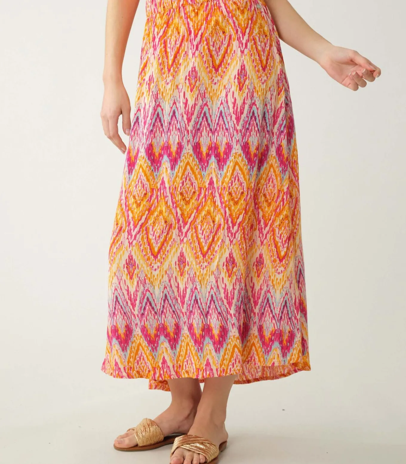 De midi–lengte en de crêpestof bieden een unieke soepelheid voor een elegante aanpak. De elastische taille garandeert comfort en pasvorm. Etnische patronen geven een levendig tintje aan je outfit.