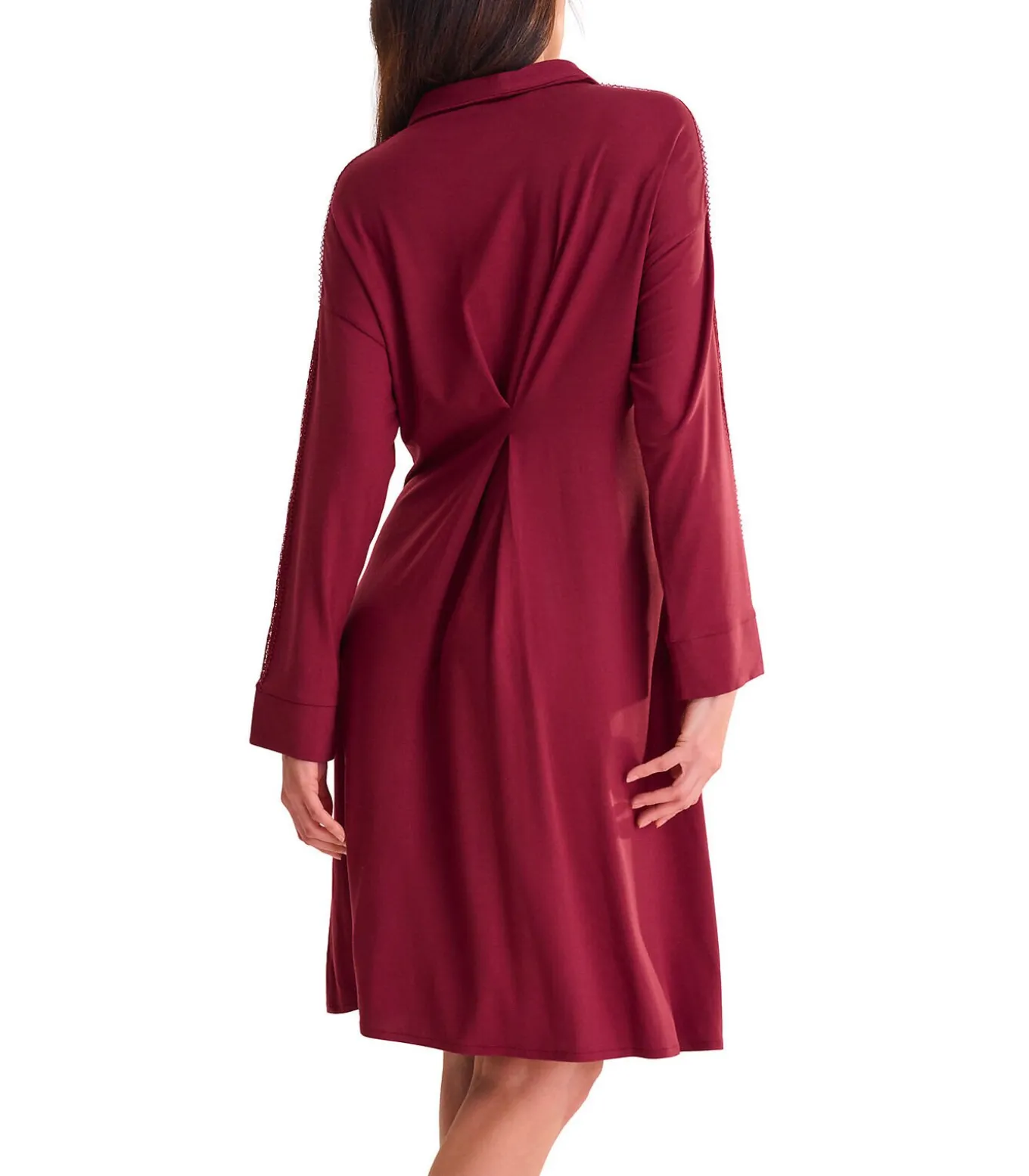 Een collectie slaapkleding die aangenaam en comfortabel aanvoelt. Het dominante materiaal is een zacht modalbreisel, gecombineerd met luxueus, weelderig borduurwerk, fijn kant en een licht, geraffineerd breisel. Deze combinatie zorgt voor een elegante look en optimaal draagcomfort. De serie is verkrijgbaar in twee sensuele tinten: granaatrood en zwart, die elk vrouwelijkheid, verfijning en kracht benadrukken.[Jurk wordt apart verkocht. Nachtjapon, lingerie en andere accessoires die het model op de foto’s draagt, zijn niet inbegrepen].