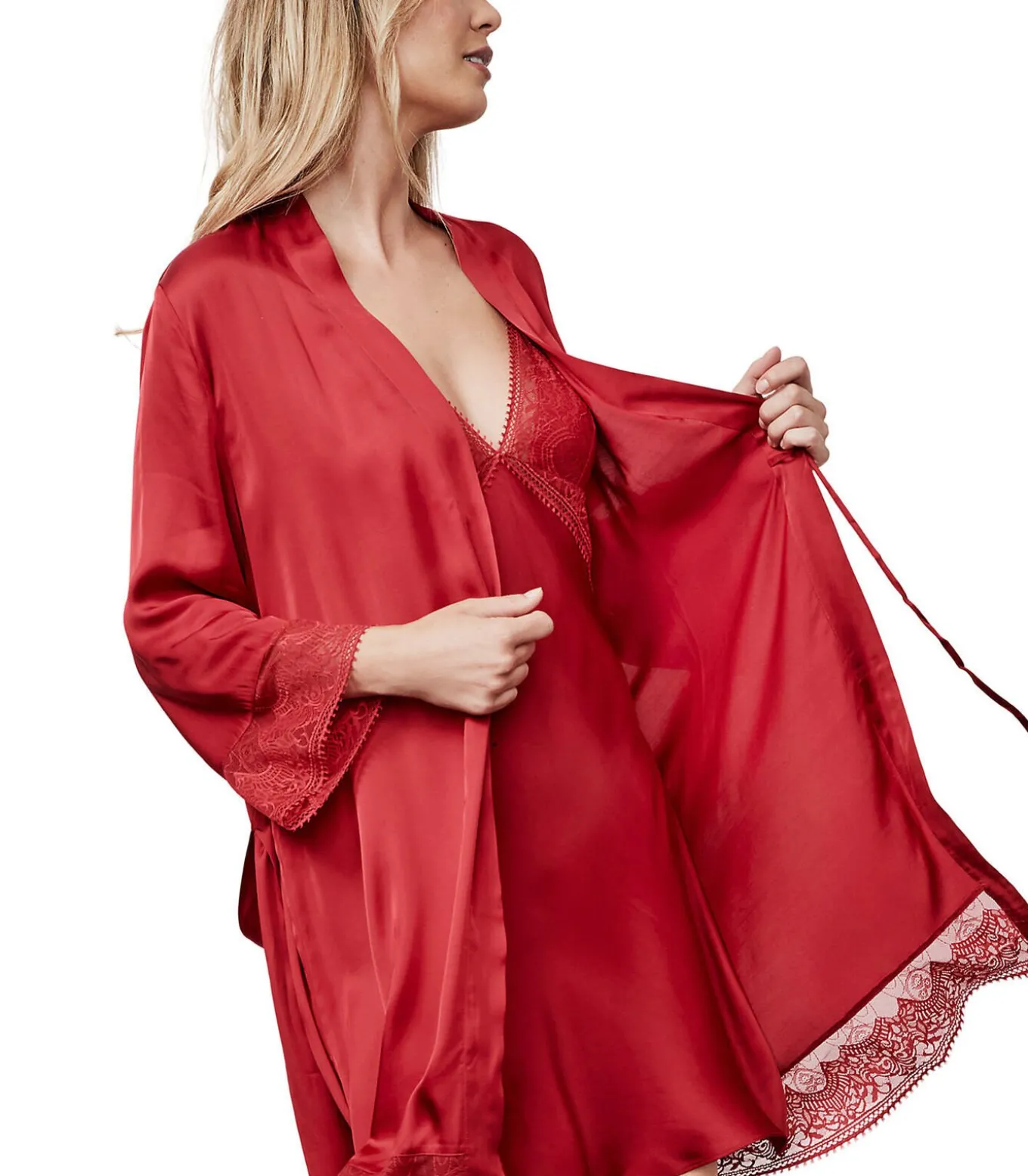 Negligé met lange mouwen voor wie comfort en sensualiteit wil combineren. Gemaakt van een luxueus zachte, lichtgewicht viscosestof, omhult het zachtjes je figuur en geeft het je een gevoel van welzijn terwijl het je rondingen benadrukt. Het verfijnde ontwerp en de kleur maken het de perfecte keuze om thuis in te ontspannen of een vleugje glamour toe te voegen aan je avondjes uit. De mouwboorden en onderkant van de outfit zijn versierd met fijn bloemen– en arabesk kant, afgewerkt met een fijn sierlijk picot–vlechtje voor een delicate touch. De flatterende snit is zorgvuldig ontworpen om bij alle lichaamsvormen te passen, terwijl subtiele details zoals de fijne bies en verstelbare tailleband een vleugje verfijning toevoegen. Of je het nu alleen draagt of over je favoriete nachtpon of lingerie, het is het toppunt van chic en sensualiteit. Het is ideaal om een romantische sfeer te creëren of gewoon om je mooi en zelfverzekerd te voelen.