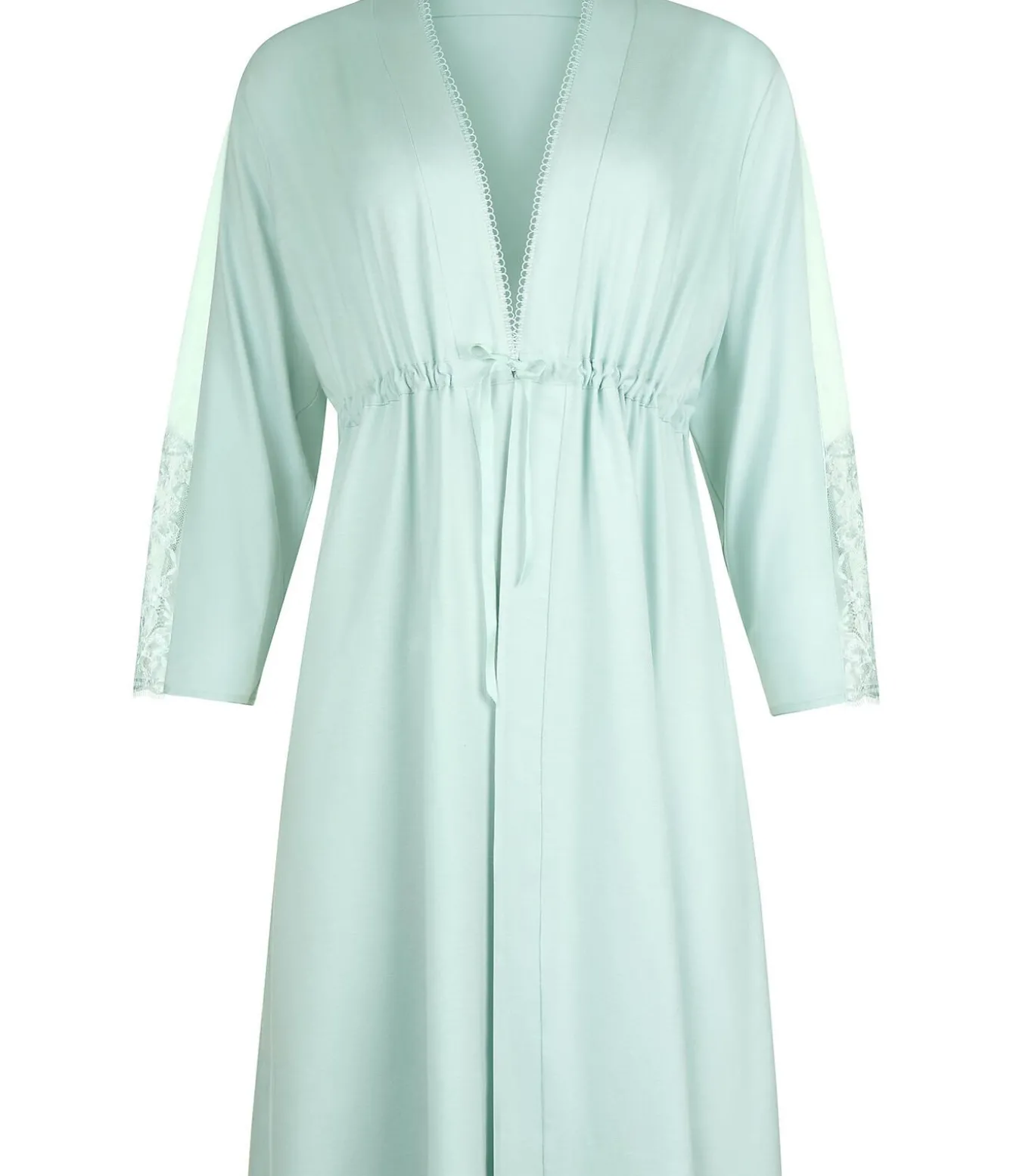 Comfortabele badjas met sluiting net boven de taille. Het satijnen lint aan de sluiting geeft het stuk extra verfijning. Wijde 3/4–mouwen met driehoekige inzetstukken van tule en kant. Halslijn afgewerkt met fijn decoratief elastiek. Lengte ca. 95 cm.