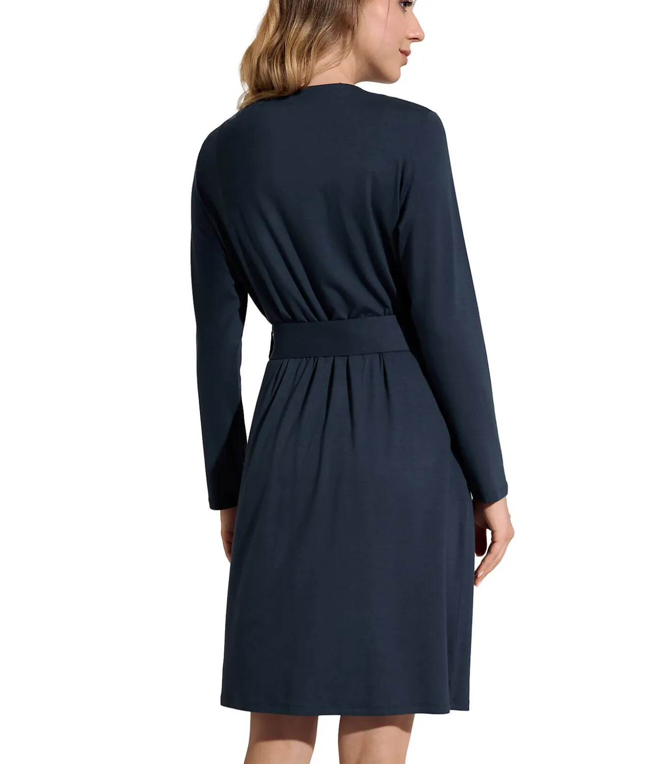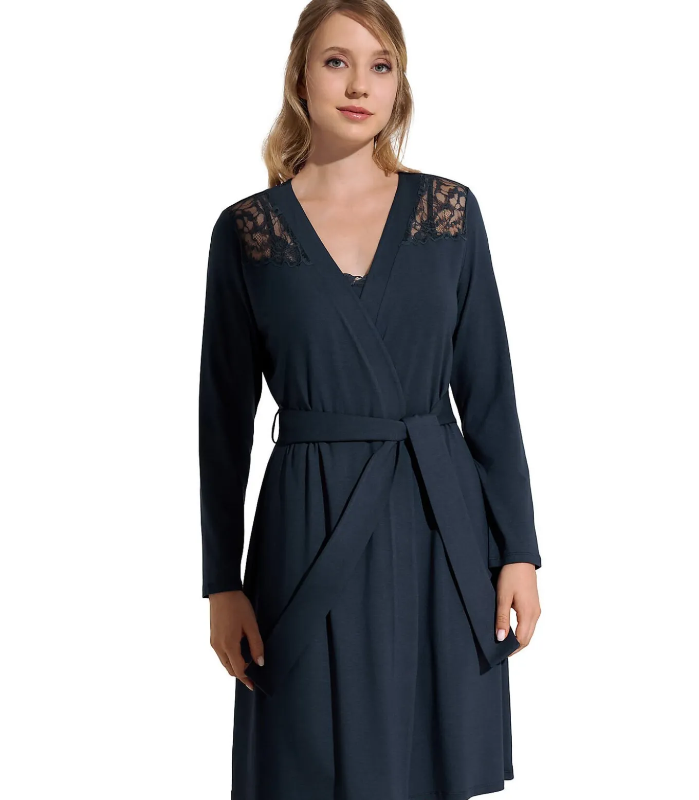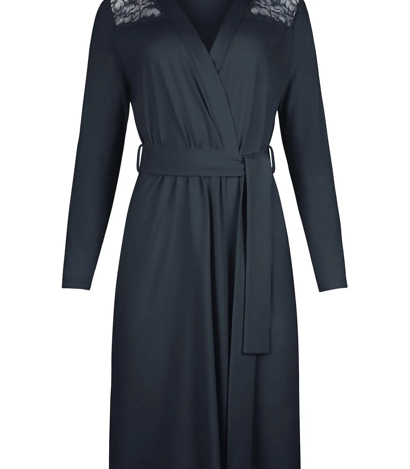 Negligé met lange mouwen en een comfortabele, elegante snit in een zacht, comfortabel breisel. Luxueus elastisch kant op de schouders. Lichte drapering aan de voorkant en ceintuursluiting. Lengte ca. 100 cm.