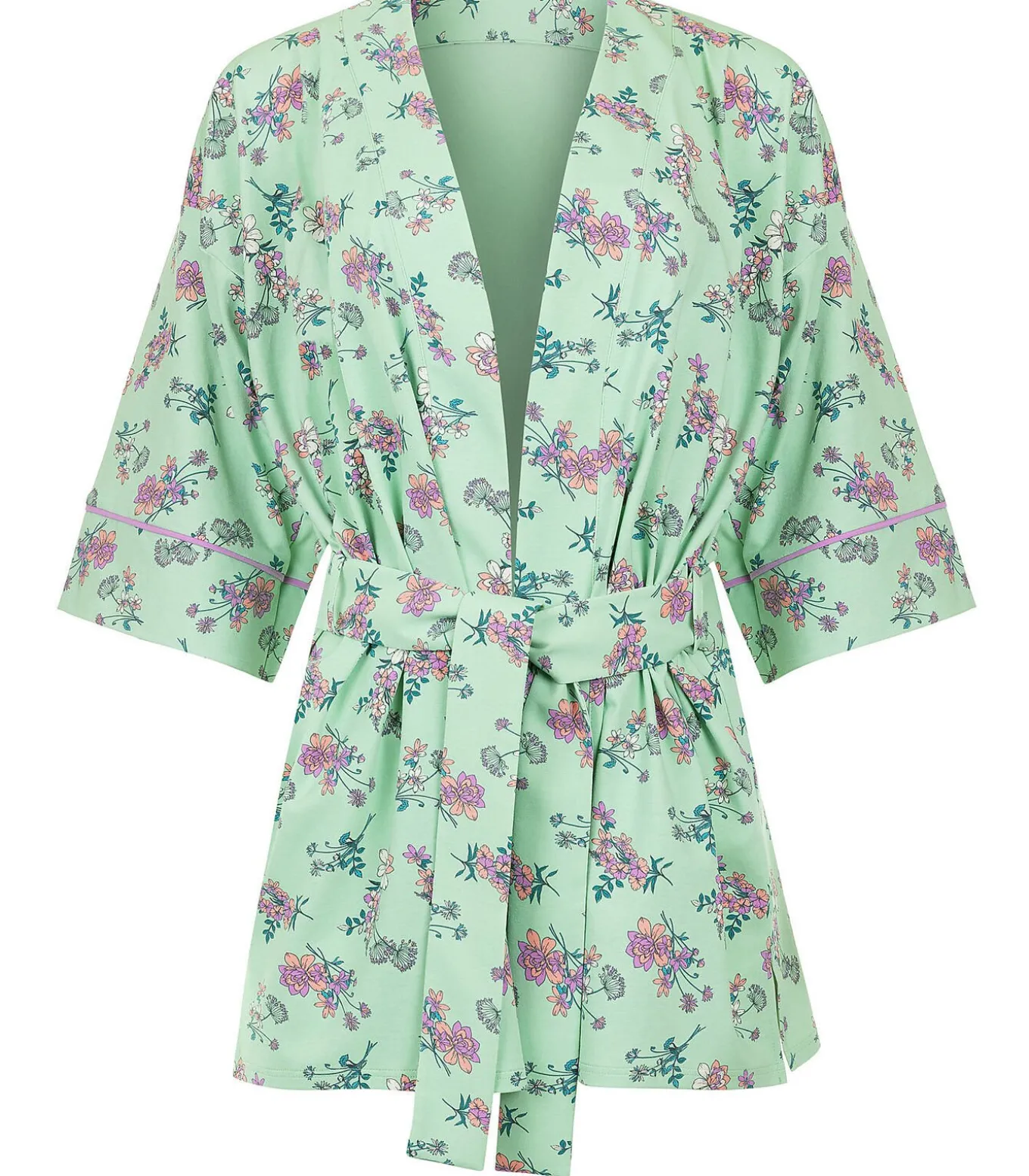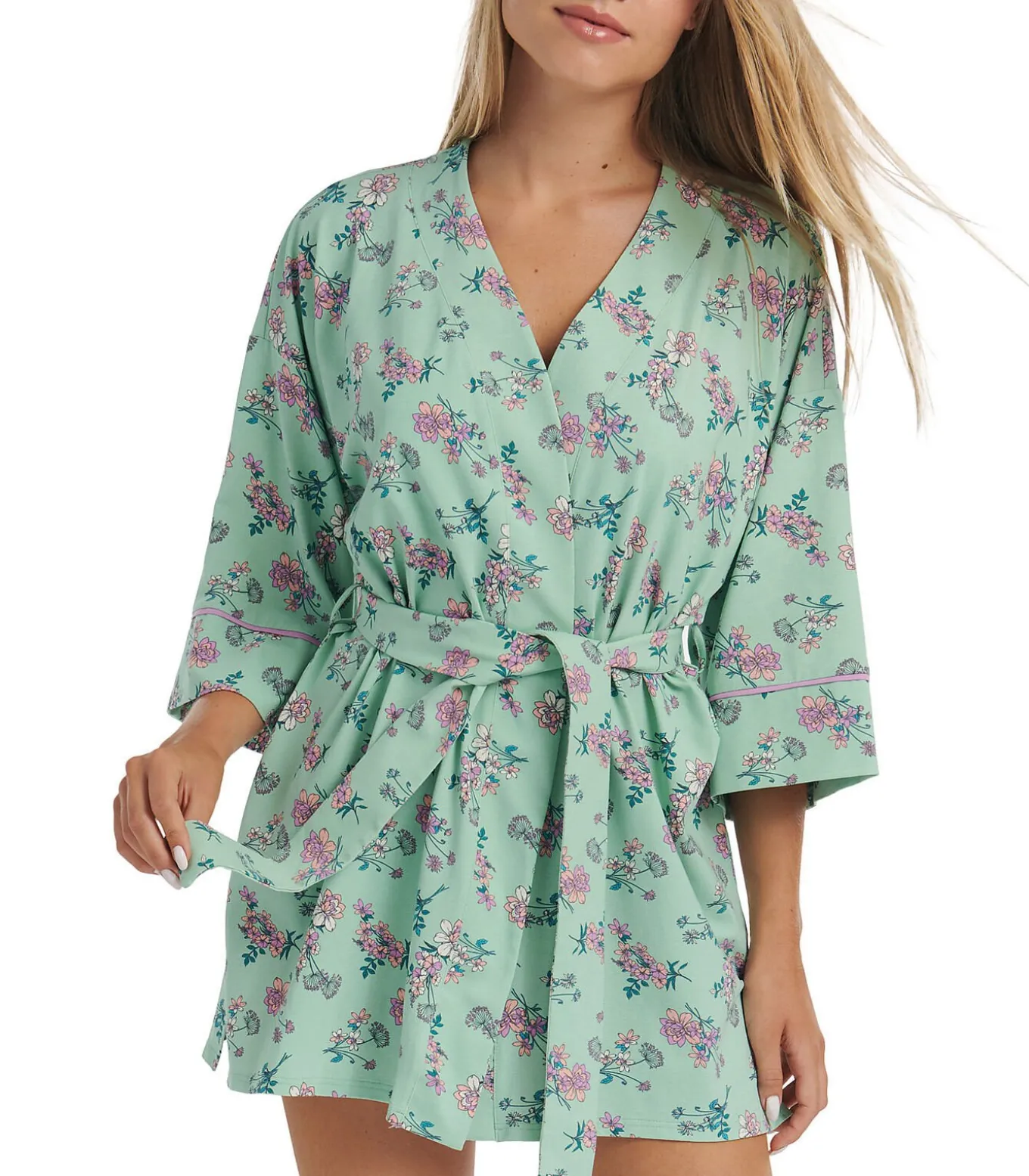 Deze zomerpyjama zal u bekoren met zijn verfrissende kleurenpalet en prachtige bloemenpatroon. Het is licht en comfortabel, en het katoenen breisel sluit goed aan op het lichaam. Twee kleurencombinaties: bloemen op een groene achtergrond, of bloemen op een blauwe achtergrond.[Jurk die alleen wordt verkocht. Pyjama’s, lingerie en andere accessoires die het model op de foto’s draagt, zijn niet inbegrepen].