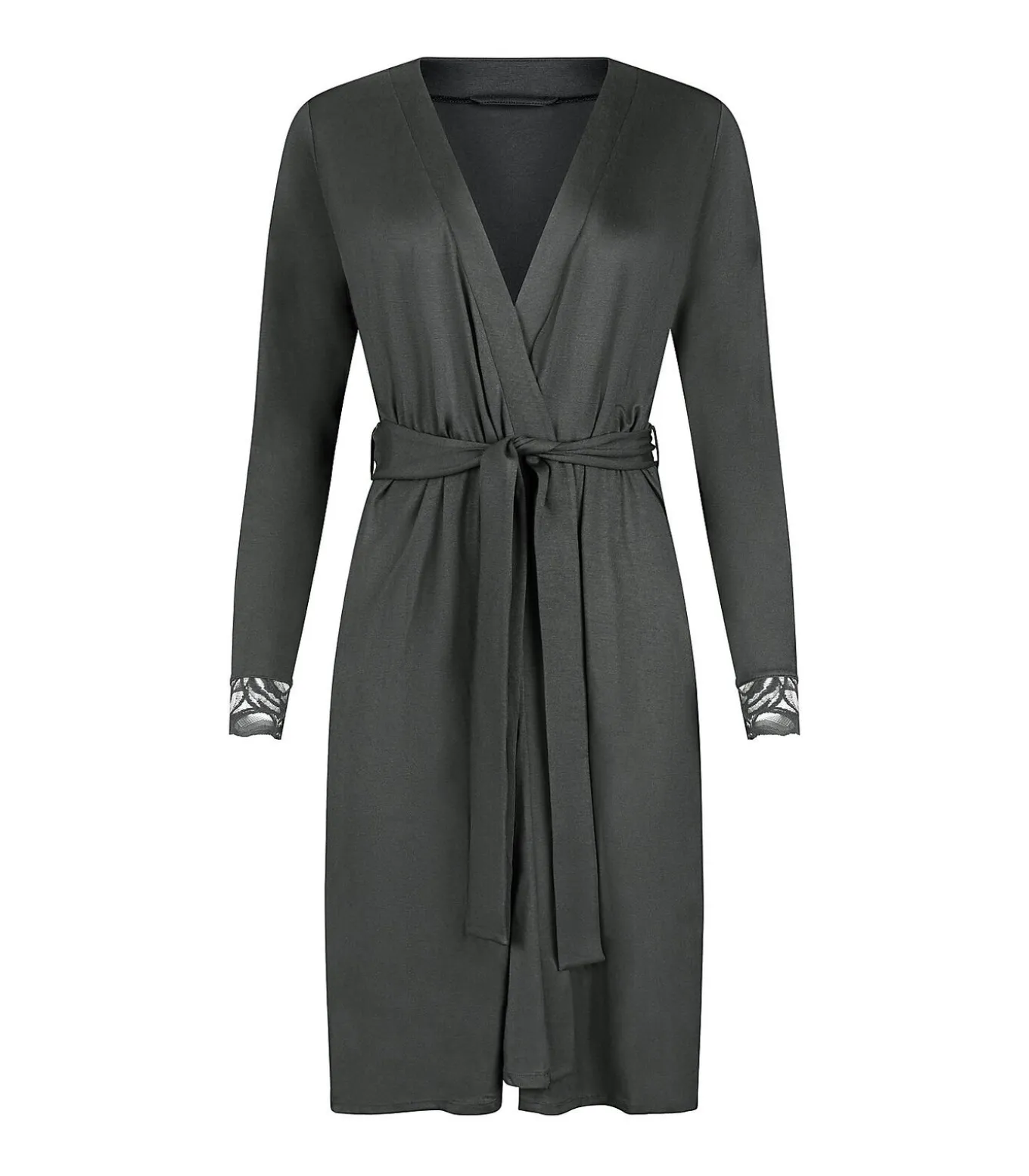 Negligé met lange mouwen in een comfortabele, elegante snit. Kanten details op de mouwen en praktische ceintuursluiting. Lengte ca. 100 cm.