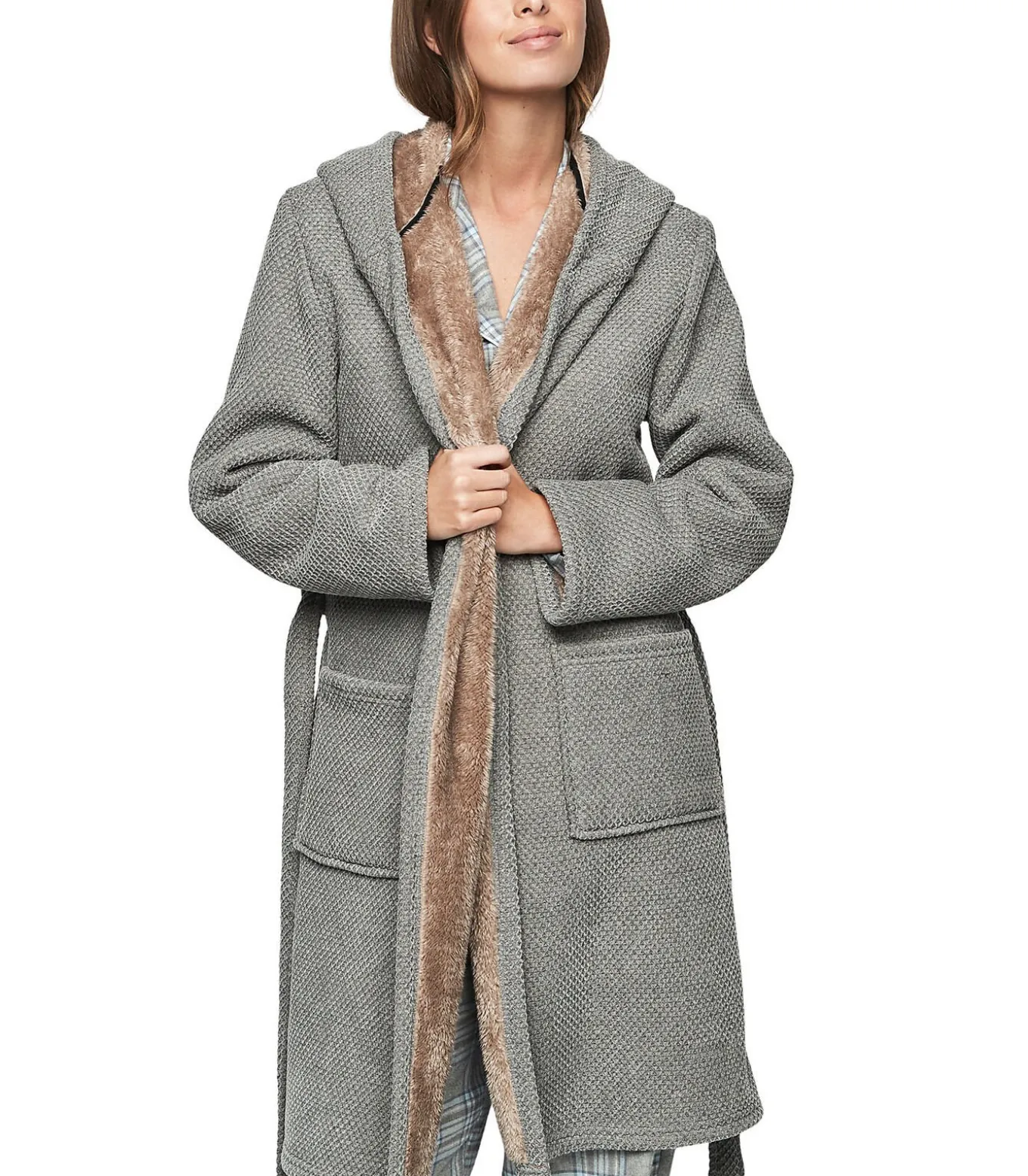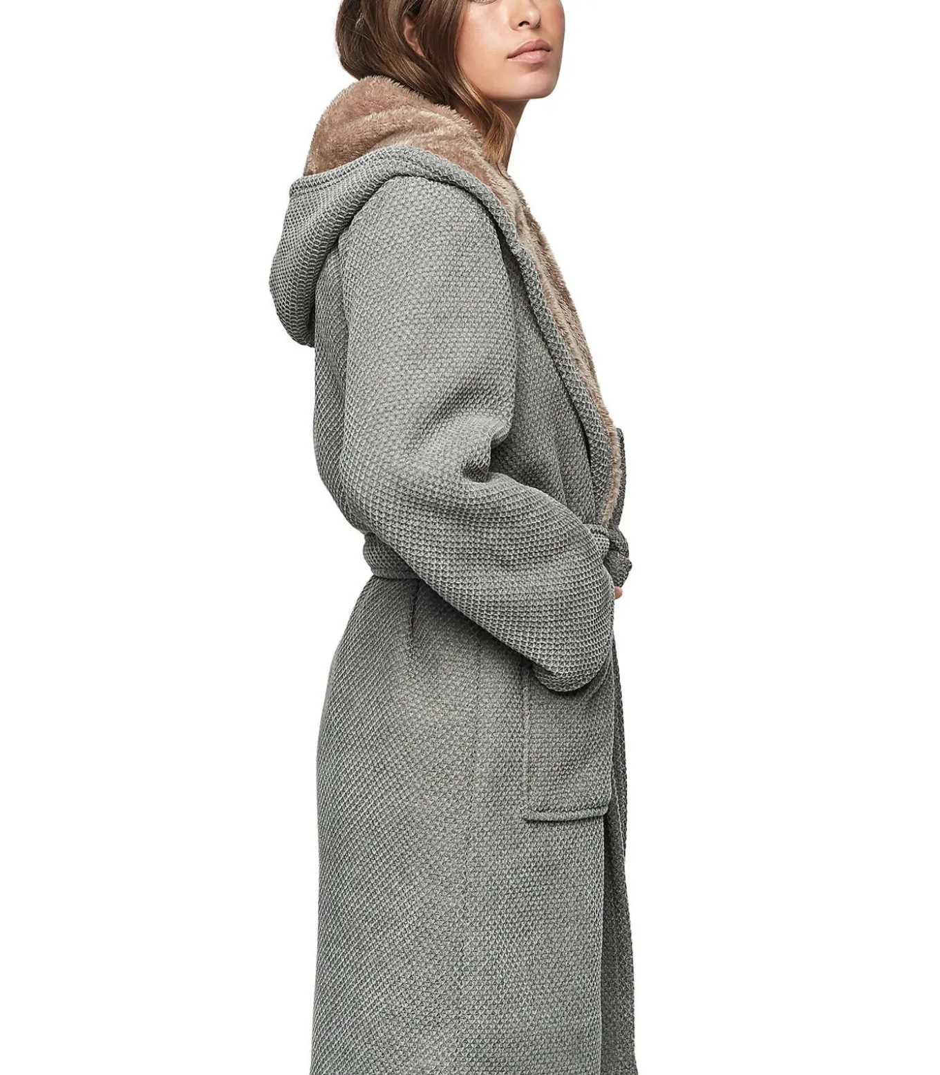 Een badjas met capuchon en bontvoering die comfort en warmte perfect combineert met elegantie en structuur. De gebreide stof is dik met een honingraatpatroon. Hij is volledig gevoerd met zacht imitatiebont voor een ultrazachte, cocooning touch. De contrasterende texturen zorgen voor een knusse en geraffineerde look. De royale capuchon is ook gevoerd voor extra comfort en warmte. Twee grote opgestikte zakken aan de voorkant maken hem praktisch. Het kan worden vastgemaakt met een bandje in de taille.[Jurk wordt apart verkocht. De pyjama en andere accessoires die het model op de foto’s draagt, zijn niet inbegrepen].
