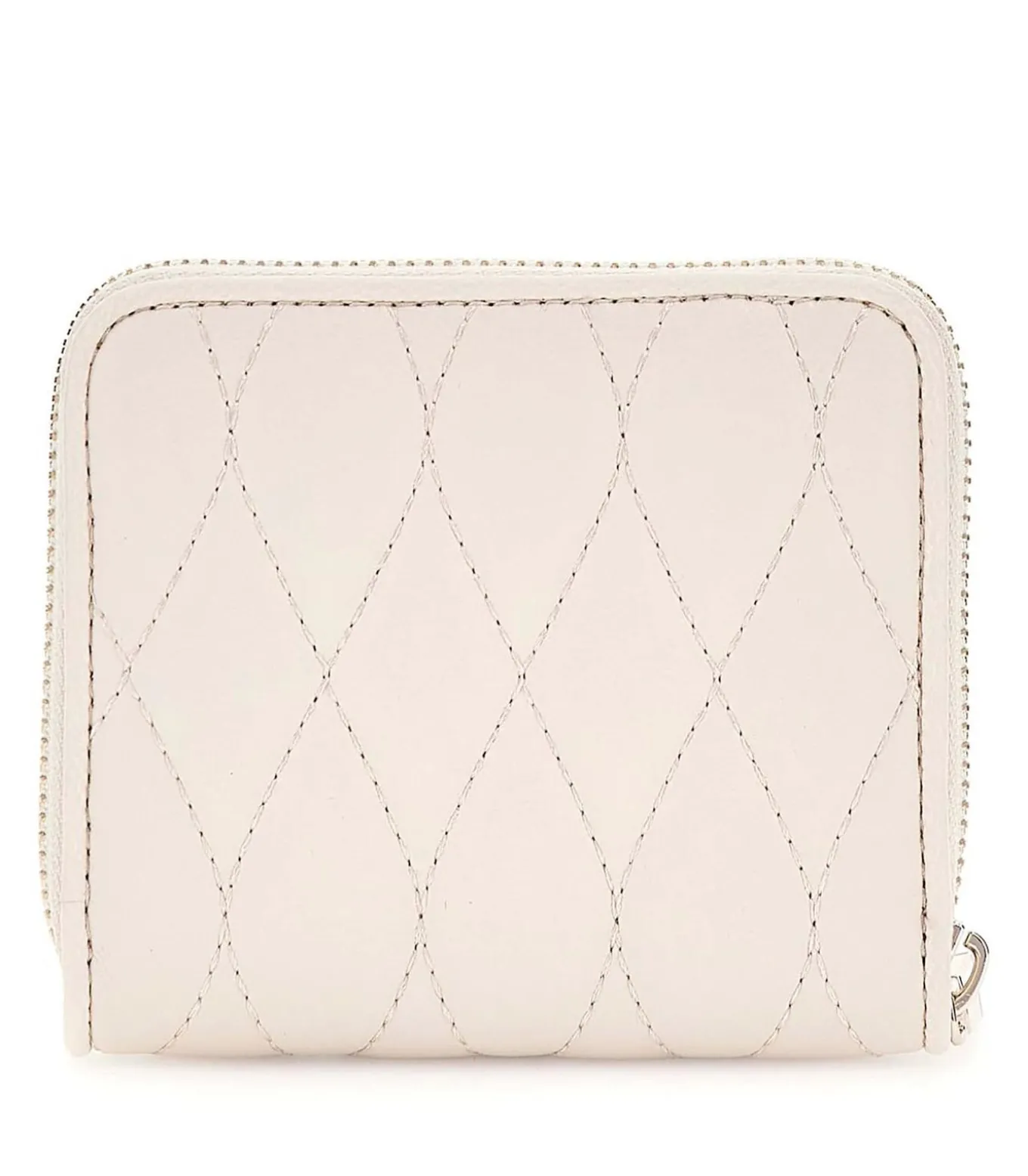 Kleur: Bone Samenstelling: 100% Polyurethaan Sluiting: Rits Binnenkant: Hoofdvak met binnenvak voor muntgeld met knoop en creditcardvakjes Afmetingen: 11 x 9 x 2 cm Details: Gewatteerde buitenkant, metalen logo–opschrift op de voorkant, lichtgoudkleurige hardware Gebruik: Compact en chic, perfect om essentiële spullen elegant en praktisch mee te nemen naar elke gelegenheid