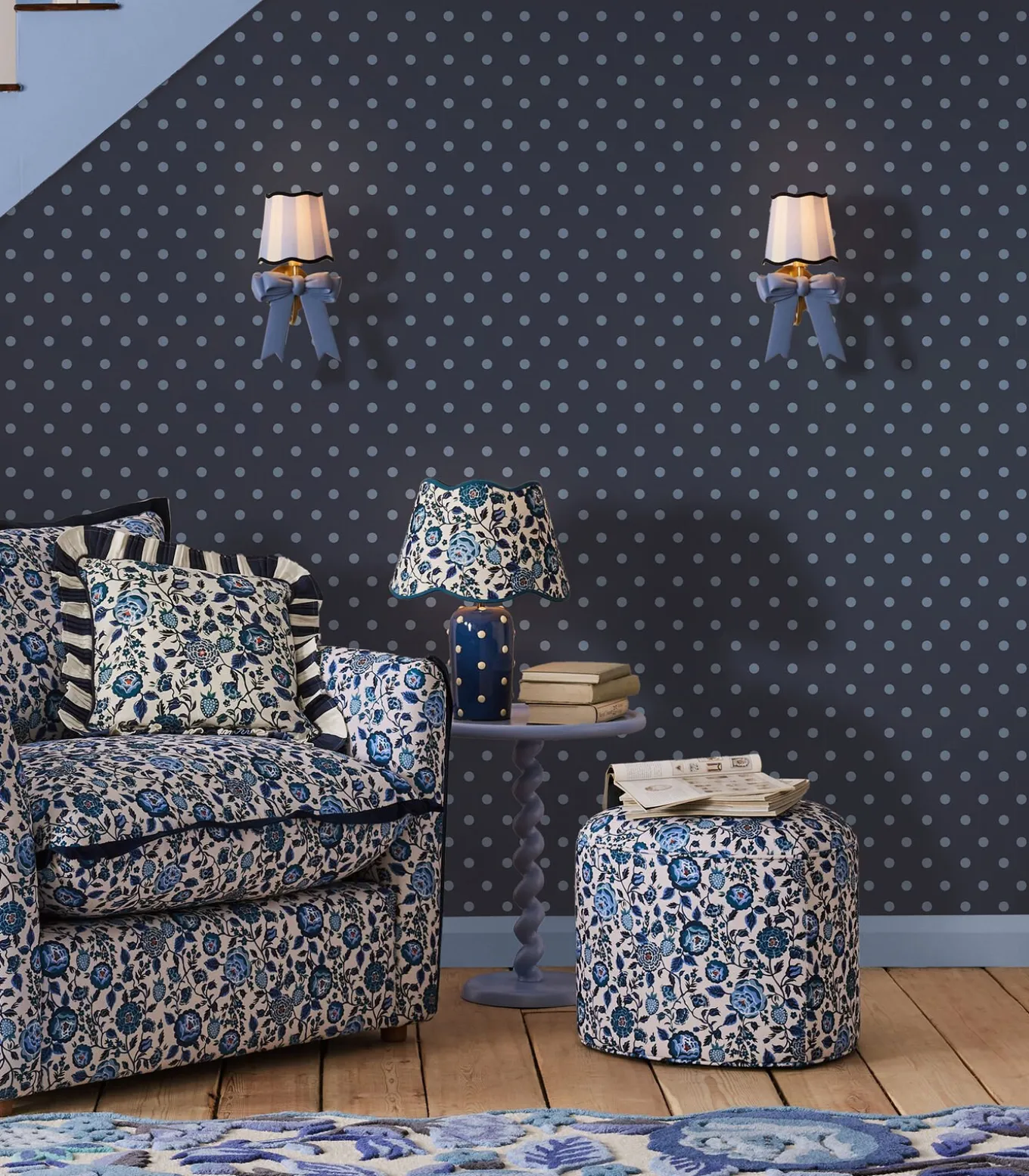 Button Spot Navy is een lief polkadotmotief dat in elke kamer prachtig zou staan. Met babyblauwe stippen op een koninklijke marineblauwe achtergrond is dit matte behang perfect Cath Kidston.
