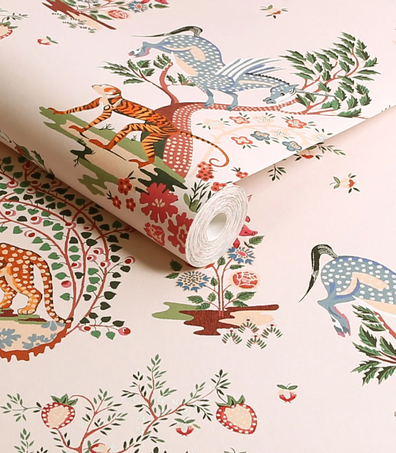 Maak fantasie werkelijkheid met Painted Kingdom Pink, dat een wereld van creativiteit en verbeelding tot leven brengt. Met een scala aan handgeschilderde dieren, van luipaarden en apen tot mythische wezens zoals eenhoorns, vliegende varkens en blauwe en rode honden. Allemaal weergegeven in veelkleurige pastelkleurige sferische ontwerpen, ingekapseld door grillige bomen, planten en bloemen, die ontzag en verwondering toevoegen aan dit unieke mooie ontwerp. Alles op een lieflijke babyroze achtergrond, afgewerkt met een matte finish voor een moderne uitstraling.
