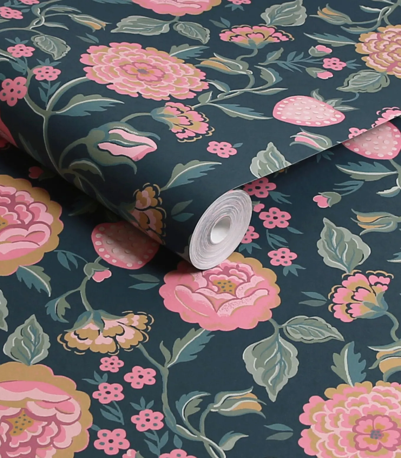 Strawberry Garden Navy is een prachtig eigentijds ontwerp van Cath Kidston in vintage stijl met fruit en bloemen. Met aardbeien en rozen in zachte tinten roze en goud, verstrengeld in saliegroene scheuten en stengels, op een rijke marineblauwe achtergrond. Hierdoor is dit mat afgewerkte behang de perfecte keuze als je op zoek bent naar die schilderachtige cottage sfeer.