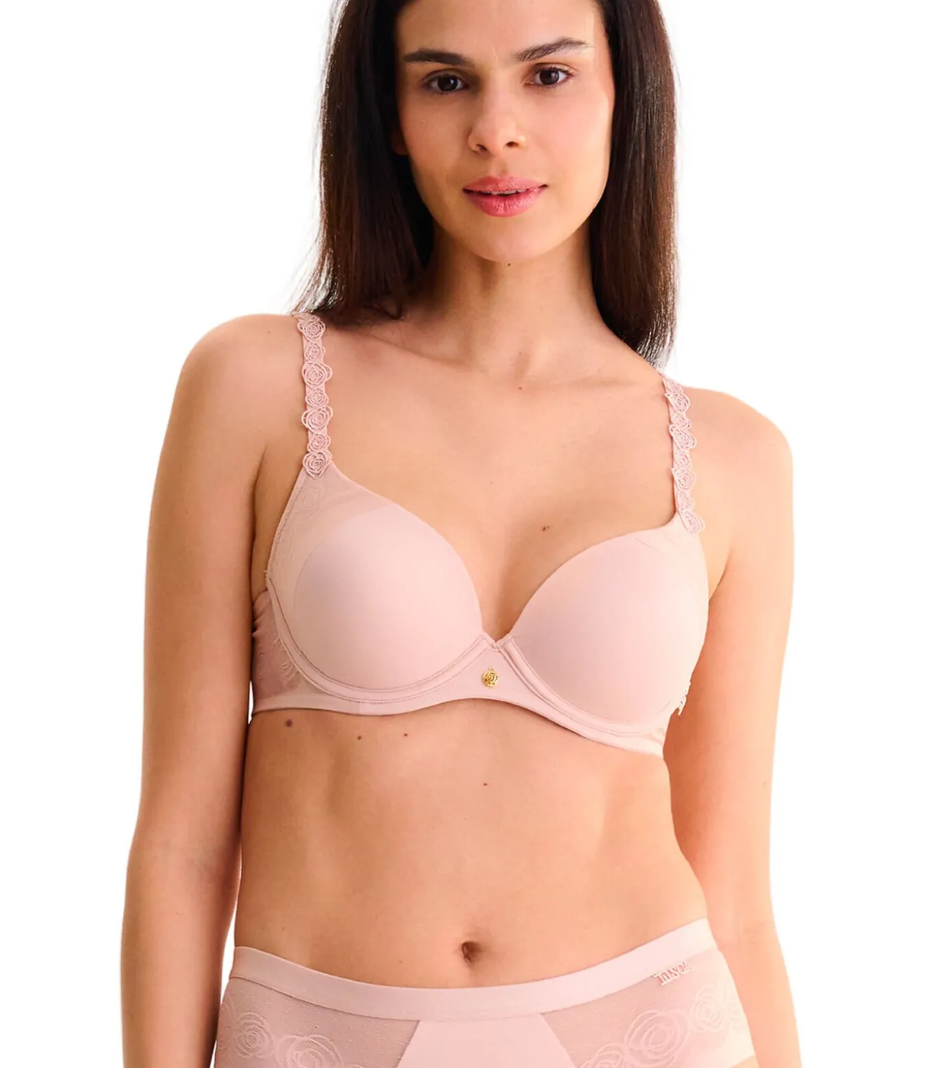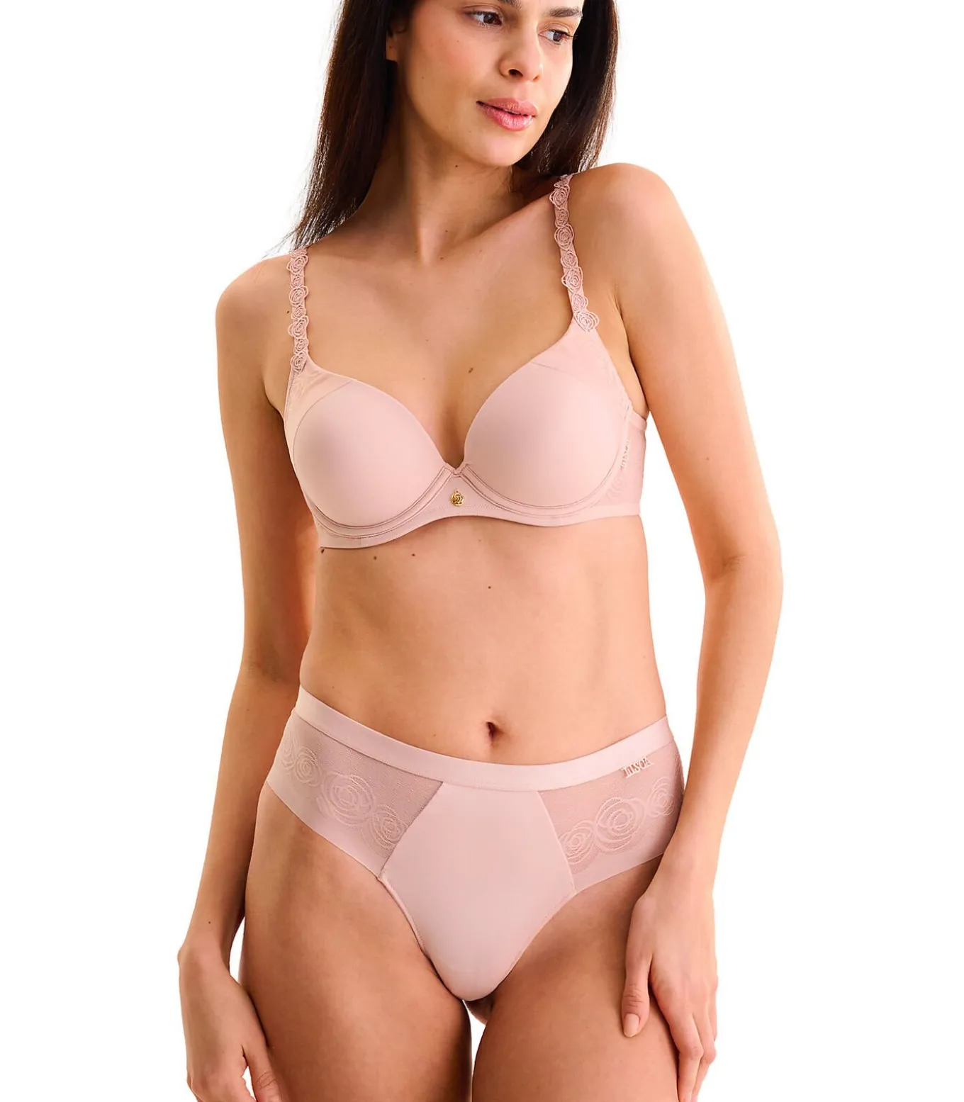 Deze verleidelijke bh biedt dagelijks comfort en elegantie. Hij heeft een functioneel ontwerp met een middenstuk uit één stuk. Aangenaam voorgevormde cups met een fluweelzachte binnenkant. Ze zijn glad aan de buitenkant voor een vlekkeloze look onder kleding. De zijkanten en bovenkant van de cups zijn versierd met transparant kant dat fijn geborduurd is met bloemmotieven en een vleugje vrouwelijkheid en verfijning toevoegt. Bij de grotere maten is de achterkant gevoerd met elastisch tule voor extra steun en comfort. De bandjes zijn fijntjes versierd met bloemenborduursel voor nog meer vrouwelijkheid. Ze zijn verstelbaar voor een perfecte pasvorm. Klein sieraad tussen de cups voor een elegante afwerking. Een model dat comfort en esthetiek combineert, praktisch voor dagelijks gebruik en chic genoeg om je verleidelijk te voelen in lingerie.