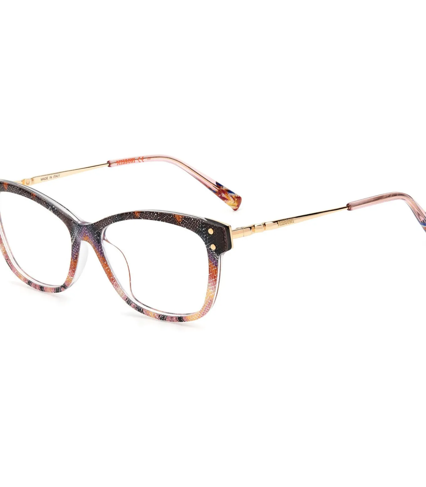 Het ontwerp van deze bril is gewoon opmerkelijk. Het cat–eye montuur is zowel vrouwelijk als gedurfd, en elle wordt versterkt door goudkleurige metalen details aan de zijkanten. De poten zijn ook versierd met het kenmerkende zigzagpatroon van het merk Missoni, dat een vleugje kleur en dynamiek toevoegt aan deze bril.