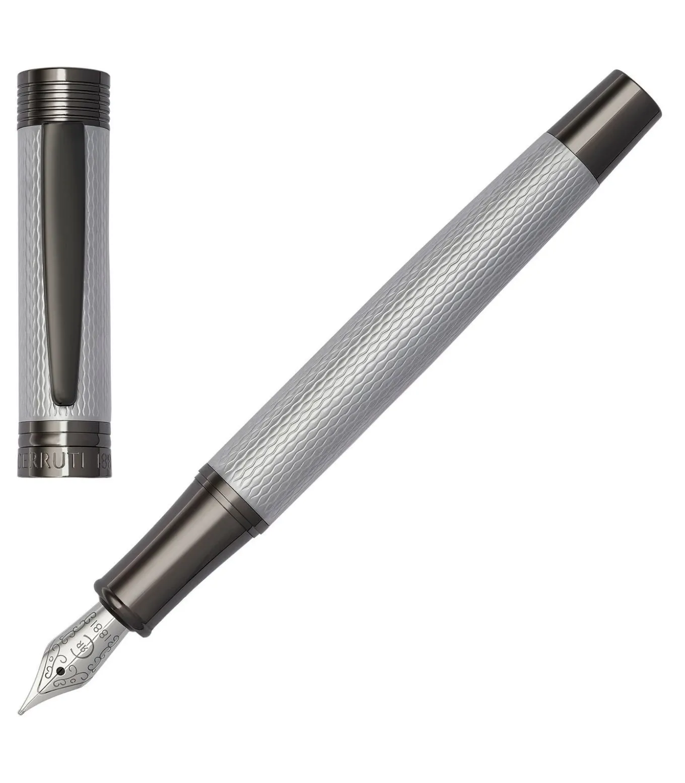 Maak kennis met deze nieuwe editie van de CERRUTI 1881 “Zoom” pen – een moderne draai aan een tijdloze favoriet. Met een herwerkte gegraveerde textuur en metalen afwerking, kies uit onze 3 kleuropties : Pistool & Chroom, Pistool & Roségoud, of Chroom & Pistool. Elk verkrijgbaar in balpen, roller en vulpenstijlen, brengt deze diamantgegraveerde editie een extra vleugje luxe aan deze markeerfavoriet. Dimensions: DIA.12/H.136 mm, Material: Brass,Matt plated,Gun plating