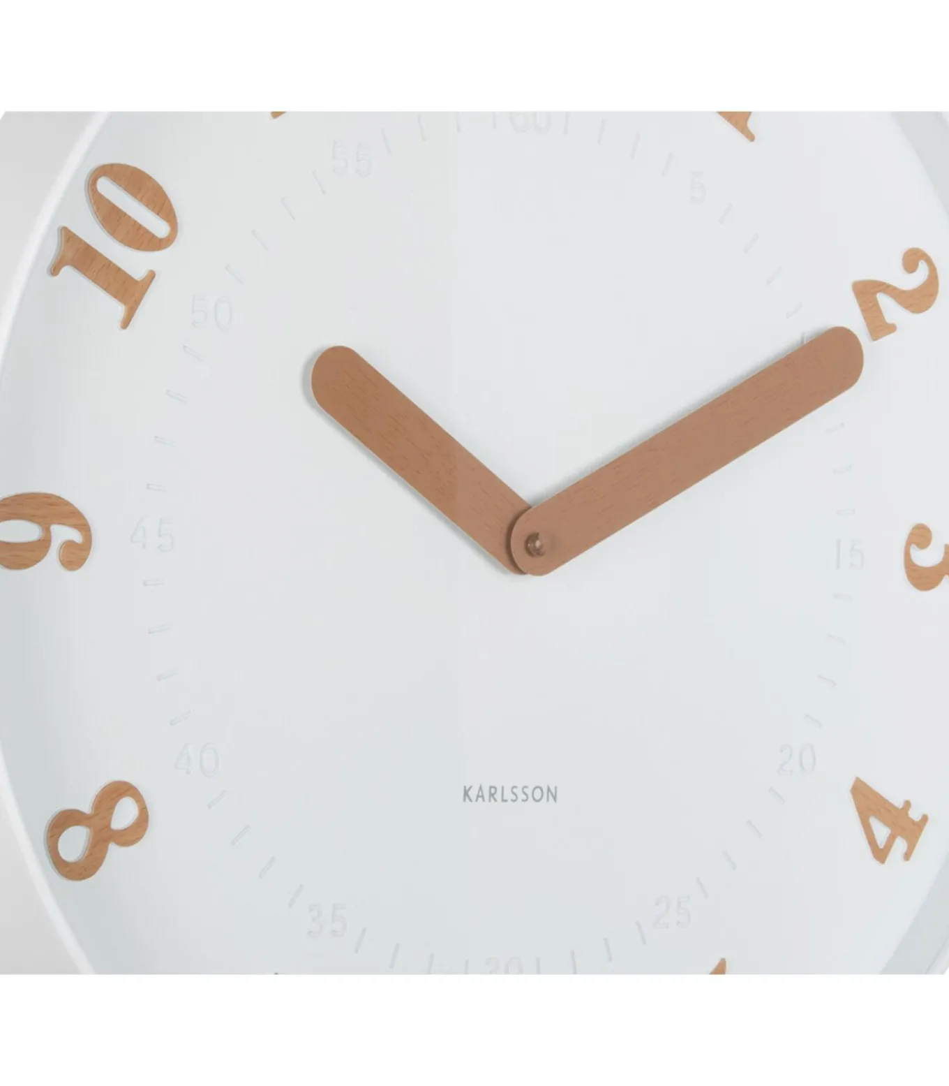 De Amena wandklok van Karlsson speelt met contrast. De wijzerplaat is strak en modern, terwijl de cijfers een warme, natuurlijke uitstraling hebben dankzij de houtkleurige afwerking. De robuuste cijfers en brede wijzers zorgen voor een duidelijke tijdsaanduiding, zonder in te leveren op stijl. De Amena past perfect binnen het Natural Glow thema en voegt karakter toe aan iedere ruimte. Een moderne klassieker met een subtiele knipoog naar natuurlijke materialen.