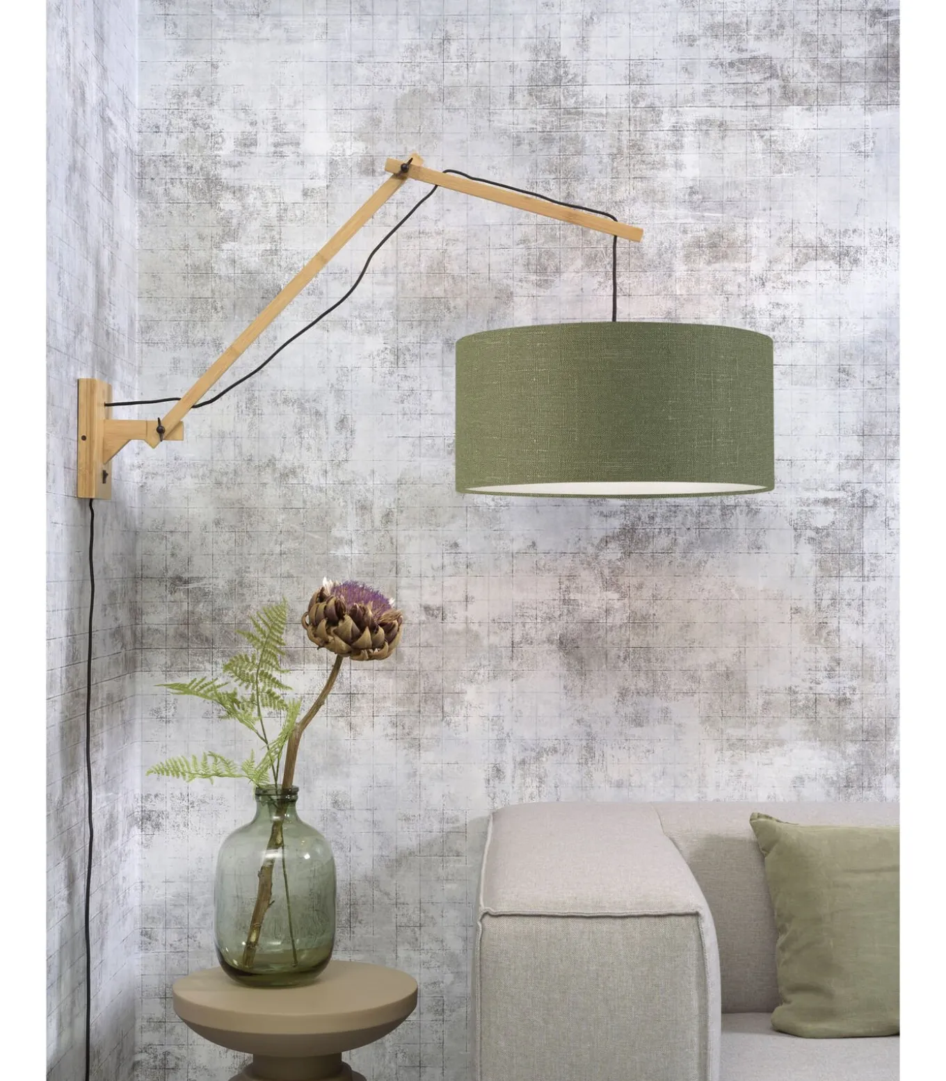De Andes wandlamp, met zijn bamboe frame en groene linnen kap, voegt een subtiele en toch harmonieuze touch toe aan elke ruimte. De lamp heeft een uitschuifbare bamboe arm voor verstelbare verlichting, waardoor hij zowel functioneel leeslicht als een stijlvolle sfeer biedt. Met zijn veelzijdige ontwerp kan hij eenvoudig aan de muur worden bevestigd, waardoor hij een chique toevoeging is aan je huis. De lampenkap heeft een diameter van 47 cm en een hoogte van 23 cm.