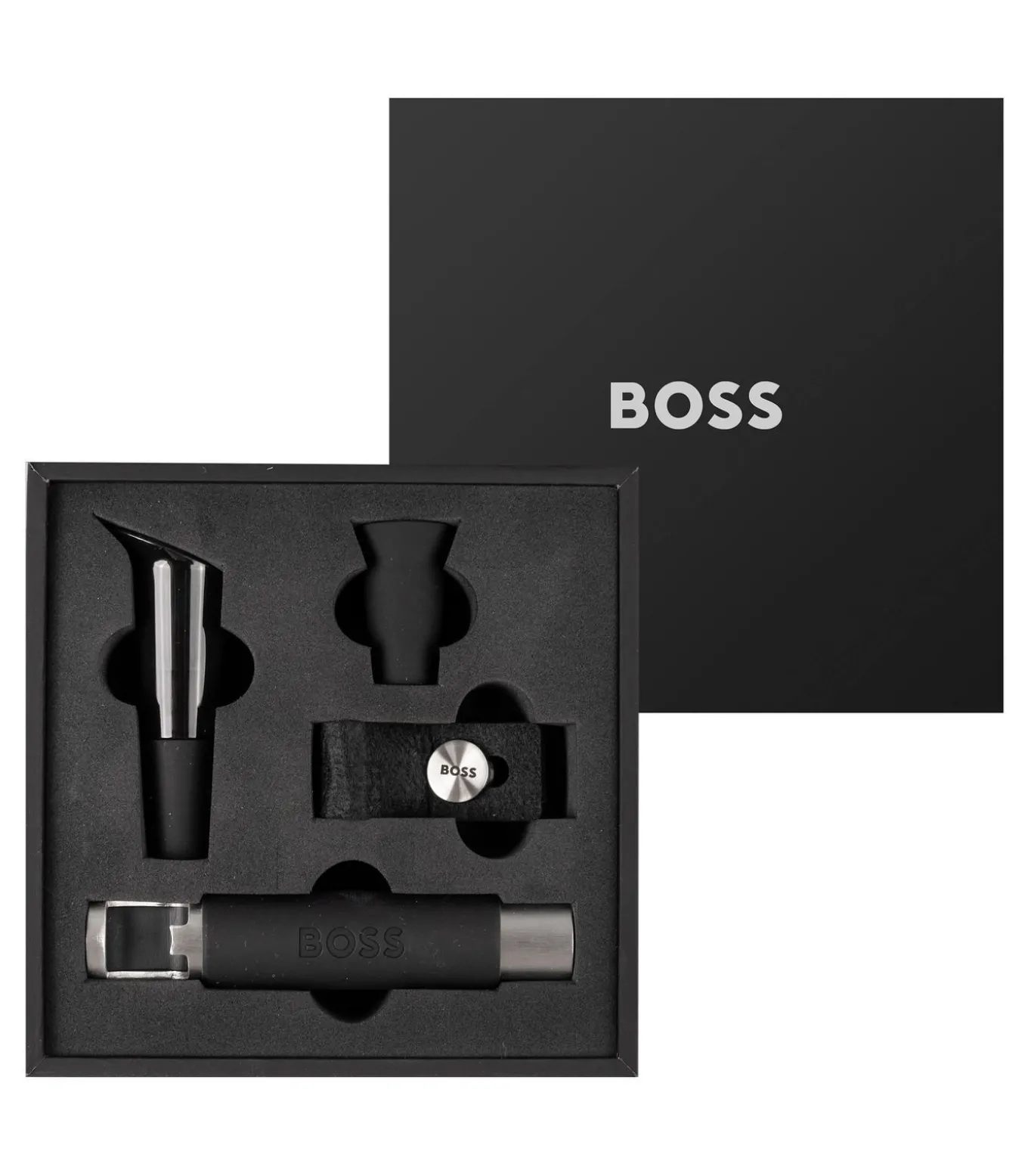 Een luxe cadeau–idee, onze nieuwe Iconic wijnset is vervaardigd uit zacht rubber en vilt enerzijds en zwaar geborsteld staal anderzijds. De prachtig bewerkte wijnset is duurzaam en wordt geleverd in een luxe BOSS–doos. Samenstelling van de sommelier set: – Geborsteld stalen hefboomkurkentrekker – Met rubber beklede flessenstop – Vilten druppelring – Machinewasbare wijnbeluchter Dimensions: DIA.15.5/STRAP:15 mm, Material: Stainless steel