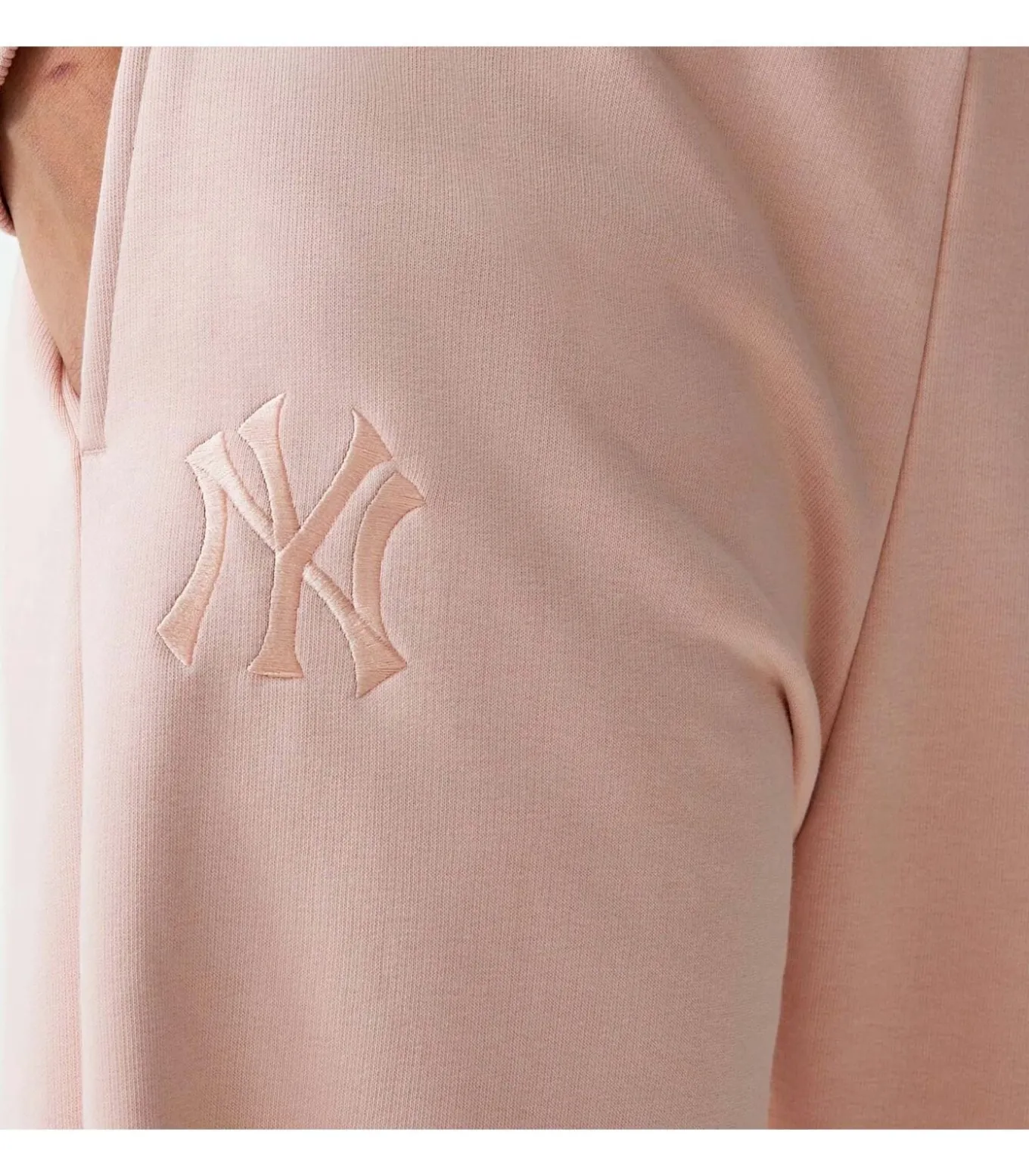 Kleur: Pastelroze. Samenstelling: 63% katoen, 37% polyester. Pasvorm: Rechte pijpen. Sluiting: Verstelbaar trekkoord. Details: Damesjoggingbroek van French Terry met zakken aan de voorkant, New York Yankees–logo op de rechterzak en geborduurde New Era–vlag op de linkerzak. Gebruik: Ideaal voor een casual en vrouwelijke look, perfect voor in de vrije tijd of te combineren met een bijpassende sweater voor een eigentijdse, sportieve stijl.