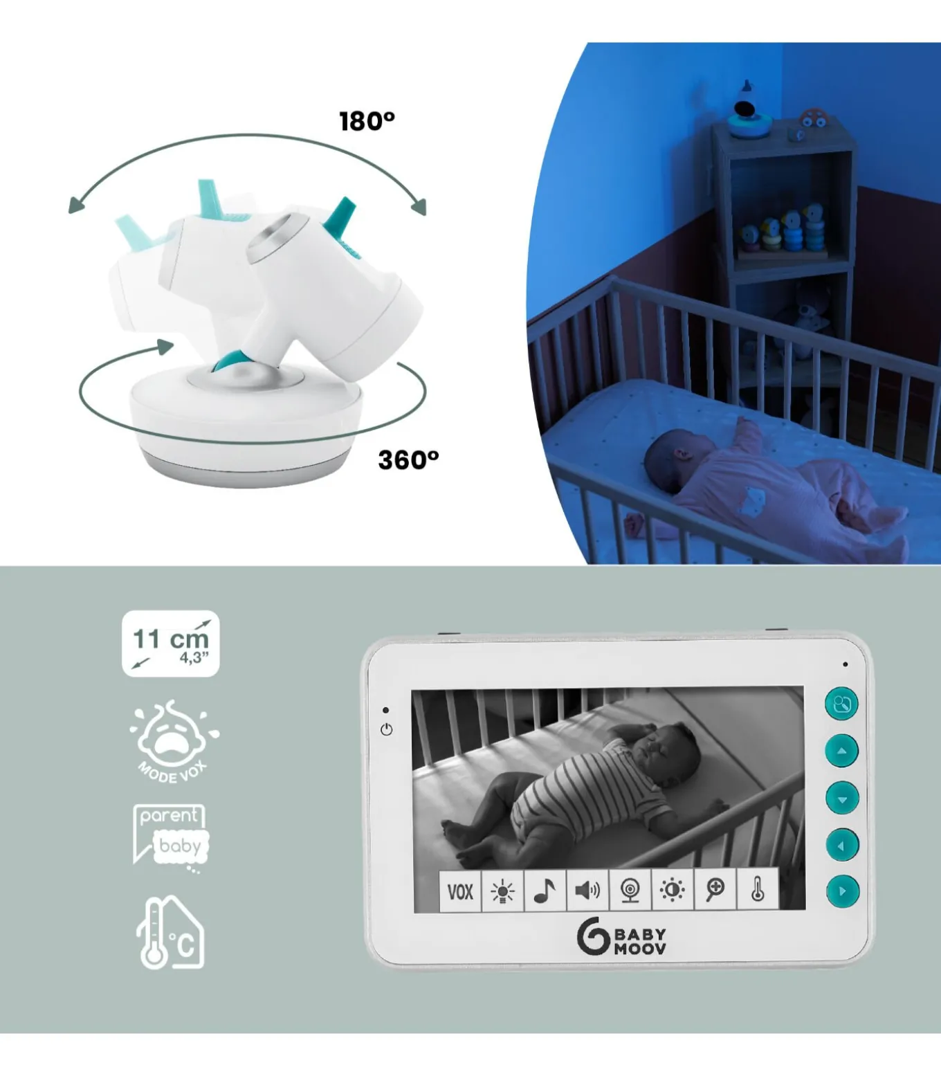 Gemotoriseerde camera, groot scherm en geïntegreerd nachtlampje! Snel aan de slag: camerabewegingen op afstand besturen vanaf de ontvanger Groot 11 cm scherm en bereik van 300 meter Meerkleurig nachtlampje (7 kleuren) 5 zachte slaapliedjes en temperatuurindicator Walkietalkie–functie om je baby gerust te stellen Ontworpen om lang mee te gaan, heeft het het LONGTIME– label gekregen, wat getuigt van zijn robuustheid en duurzaamheid!