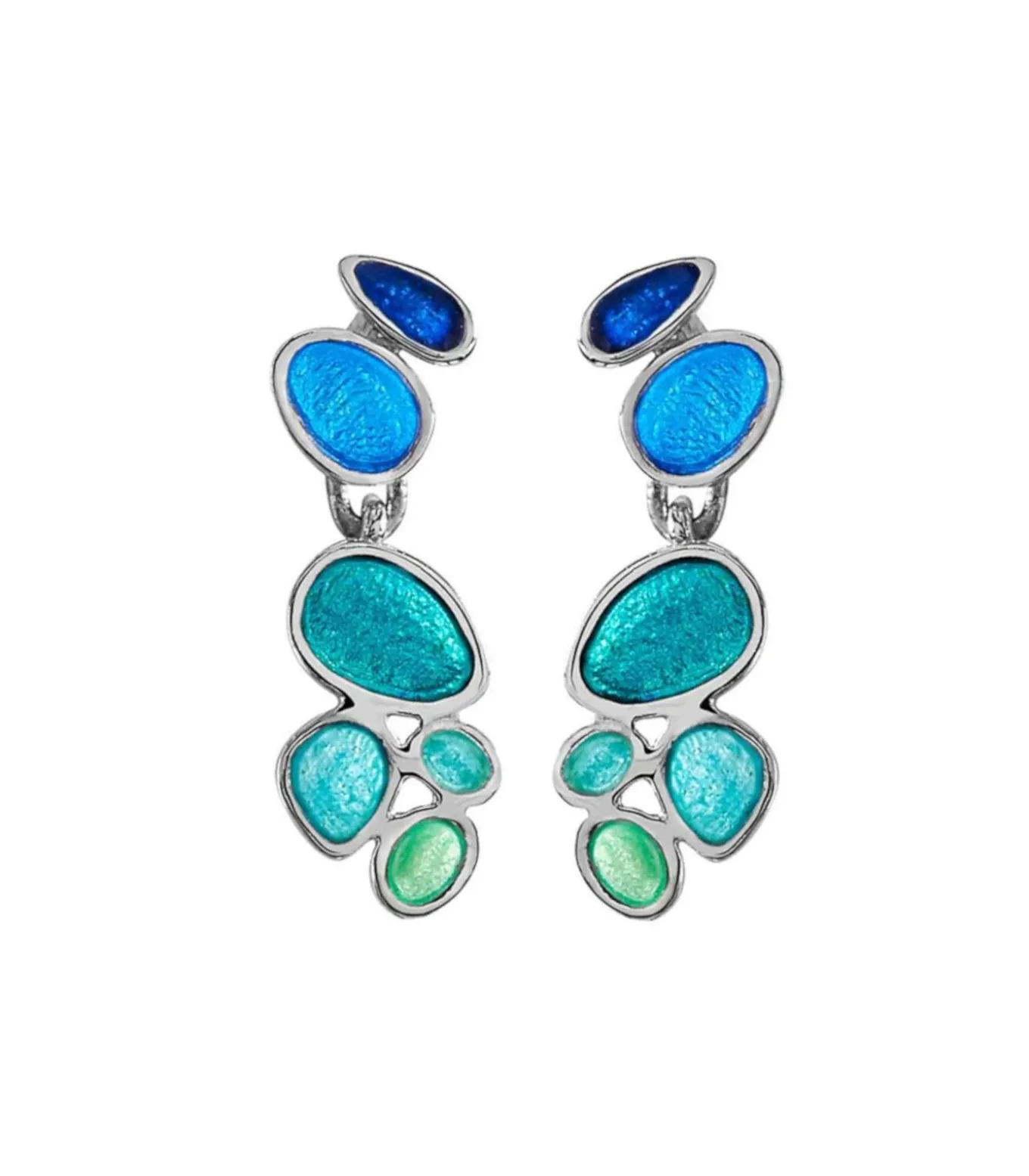 Bewegende oorbellen van glanzend 925 zilver en vlamemail in blauwe tinten. Ontwerp van verschillende ovale vormen. Stuk geinspireerd door de decoratieve elementen van de Casa Batllo, het werk van architect Antoni Gaudi, 1904–1906. Vlindersluiting.