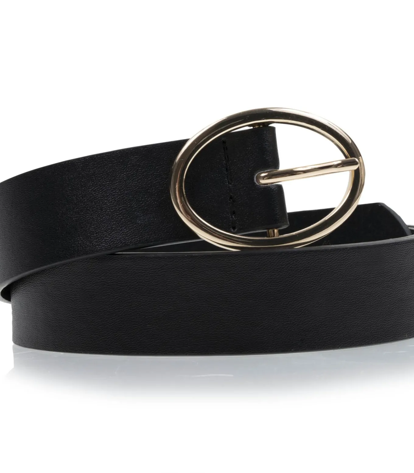 Deze zwarte riem voor dames geeft je outfit de finishing touch. Met zijn ovale gouden gesp combineert deze damesriem moderniteit en elegantie. Deze riem is 3 cm breed en is perfect om je outfits mee te versieren!