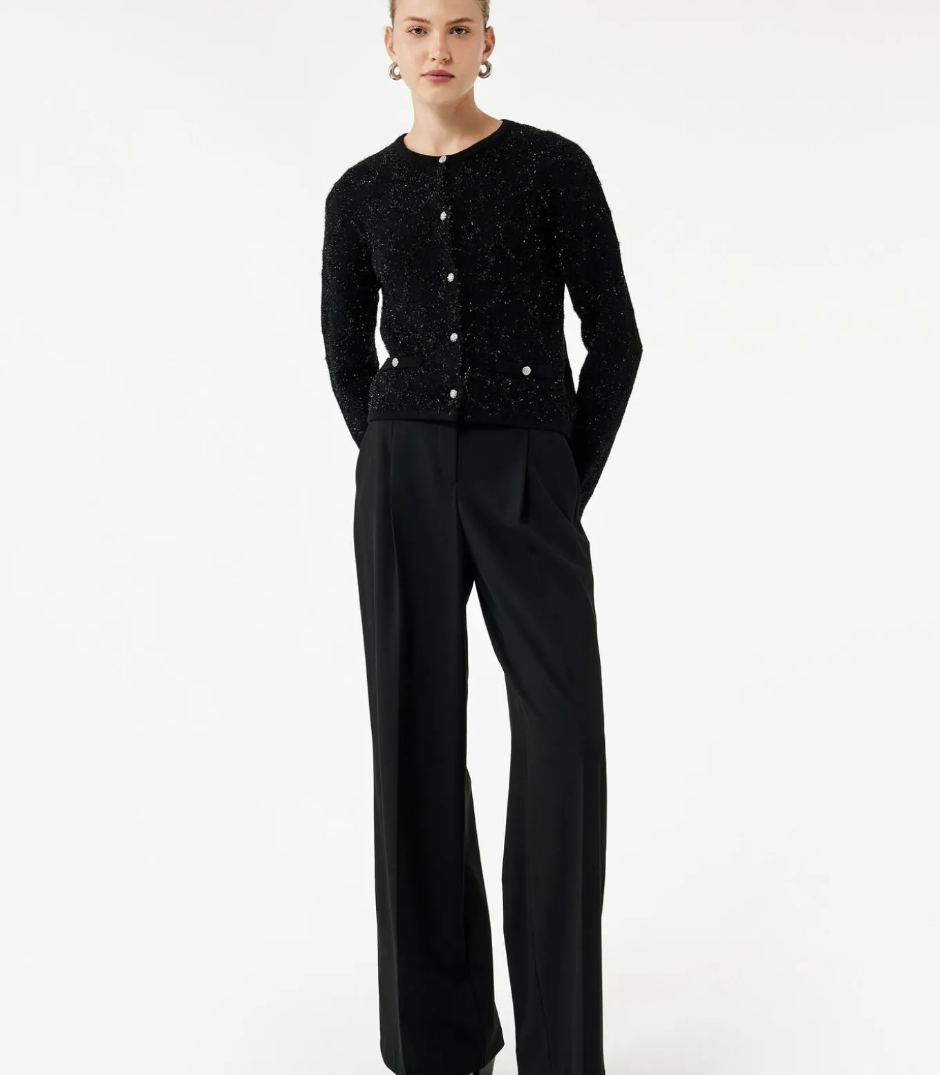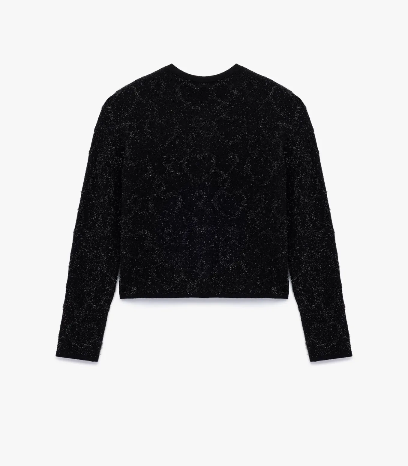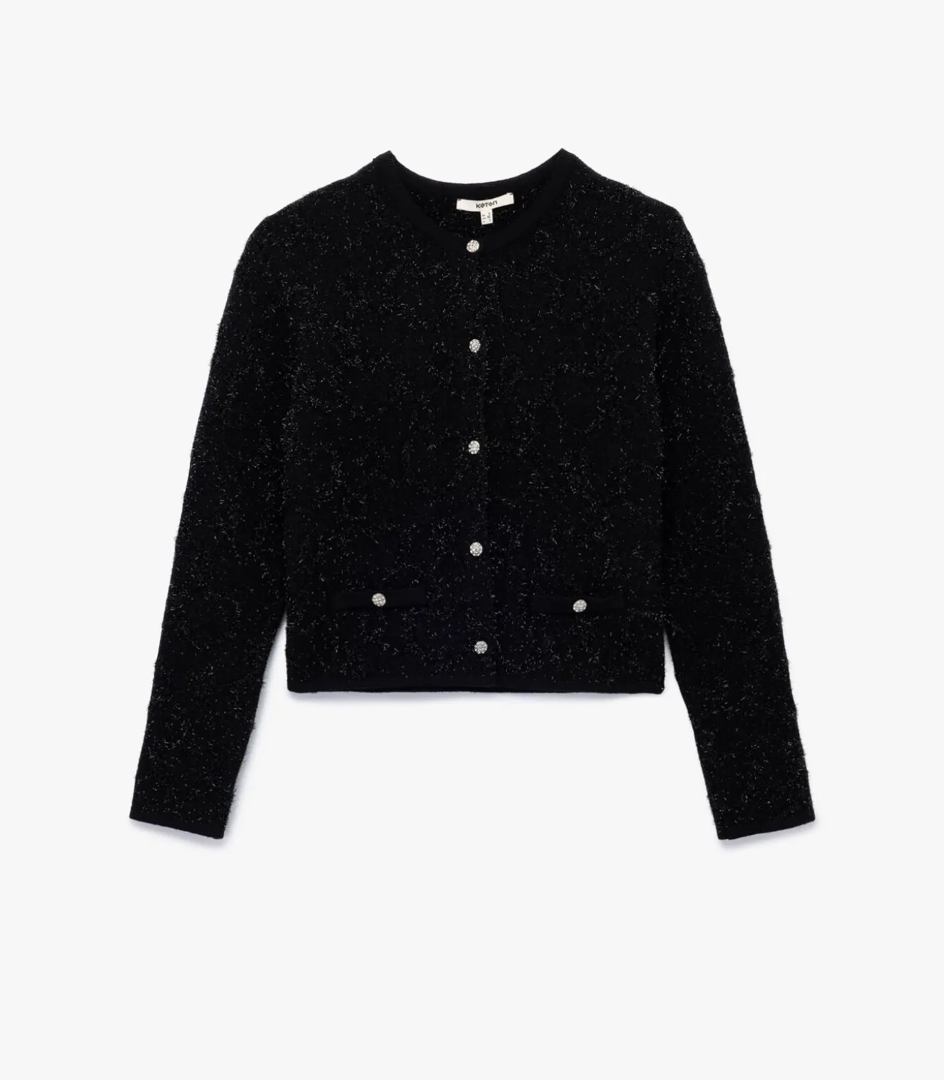 Deze elegante zwarte gebreide cardigan valt op met zijn subtiele metallic detail en veelzijdig ontwerp. De knoopsluiting en de ronde hals geven een verfijnde touch die perfect past bij zowel casual als formele outfits. Gemaakt van hoogwaardige materialen, biedt deze cardigan comfort en een vleugje glans die je look compleet maakt.