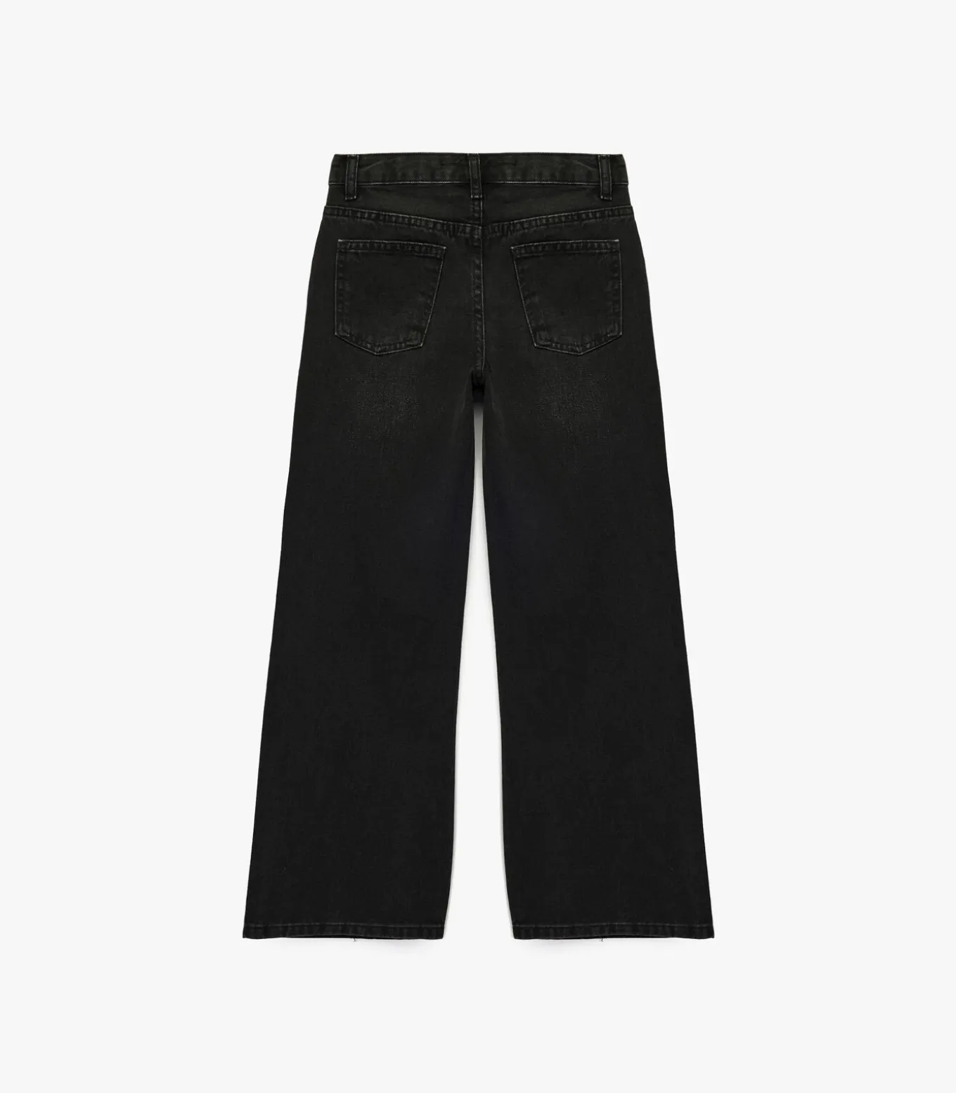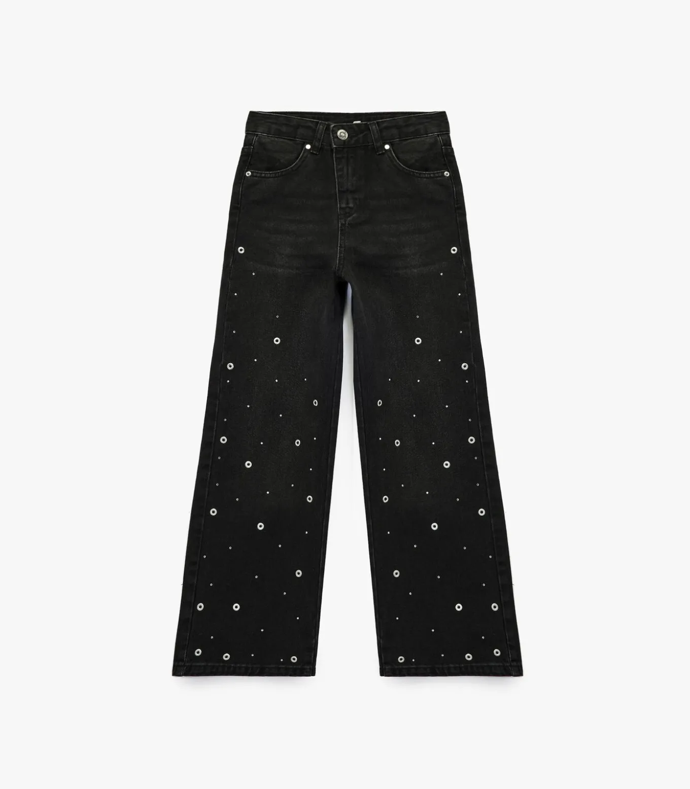 Deze zwarte spijkerbroeken voor meisjes brengen een speelse twist aan de garderobe met hun opvallende stuudetails. De wijde pijpen en losse pasvorm bieden ultiem comfort en zijn ideaal voor dagelijks gebruik. Met een normale taille en de praktische zakken is dit kledingstuk niet alleen stijlvol maar ook functioneel. Gemaakt van 100% katoen, waardoor ze perfect zijn voor een dagje uit of voor op school.