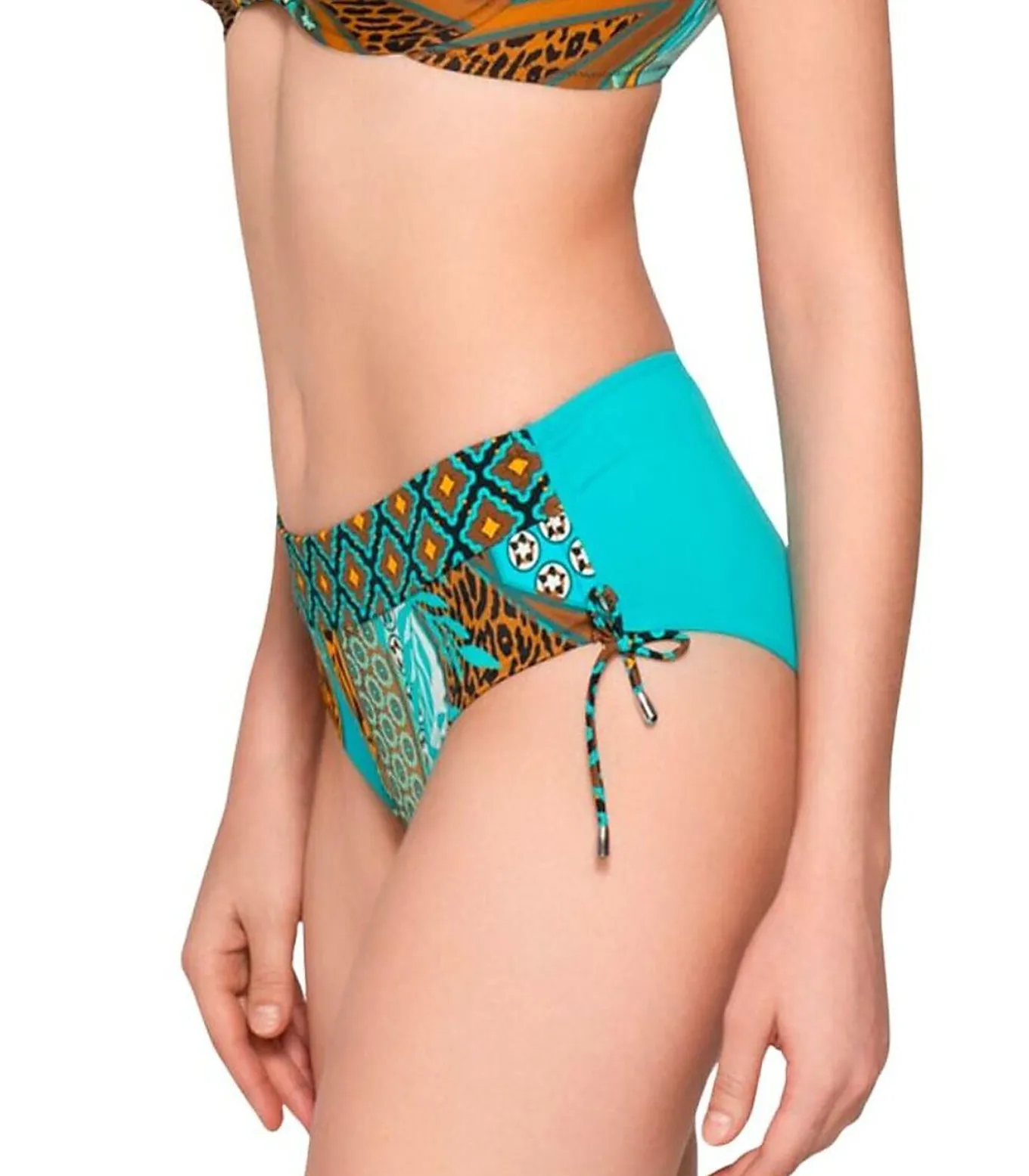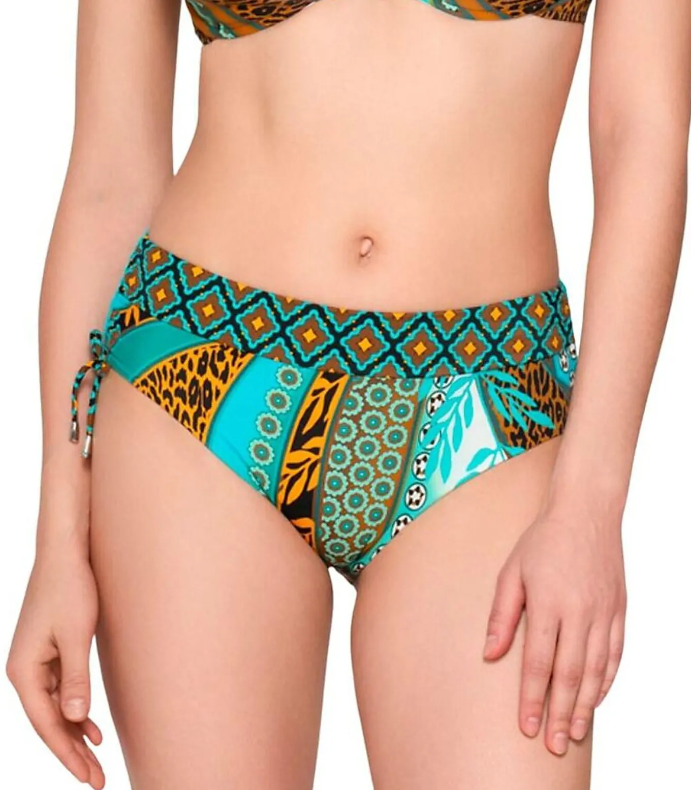 Deze zwemkleding slip heeft een flatterende hoge taille die zowel comfort als ondersteuning biedt. Het heeft verstelbare rimpels aan de zijkanten met strikkoordjes, zodat je de hoogte van de inkeping naar wens kunt aanpassen. De metalen punten aan het uiteinde van de trekkoorden zorgen voor een elegante touch. De originele patchworkprint op de voorkant combineert geometrische, bloem– en dierenmotieven in intense kleuren. Achterkant in één kleur. Dit gedurfde, kleurrijke ontwerp geeft een dynamische, on–trend look, perfect voor een gedurfde zomerlook.[Zwempakje apart verkrijgbaar. Topje en zwembroekje worden apart verkocht. Het topje, de sieraden en andere accessoires die het model op de foto’s draagt, zijn niet inbegrepen].