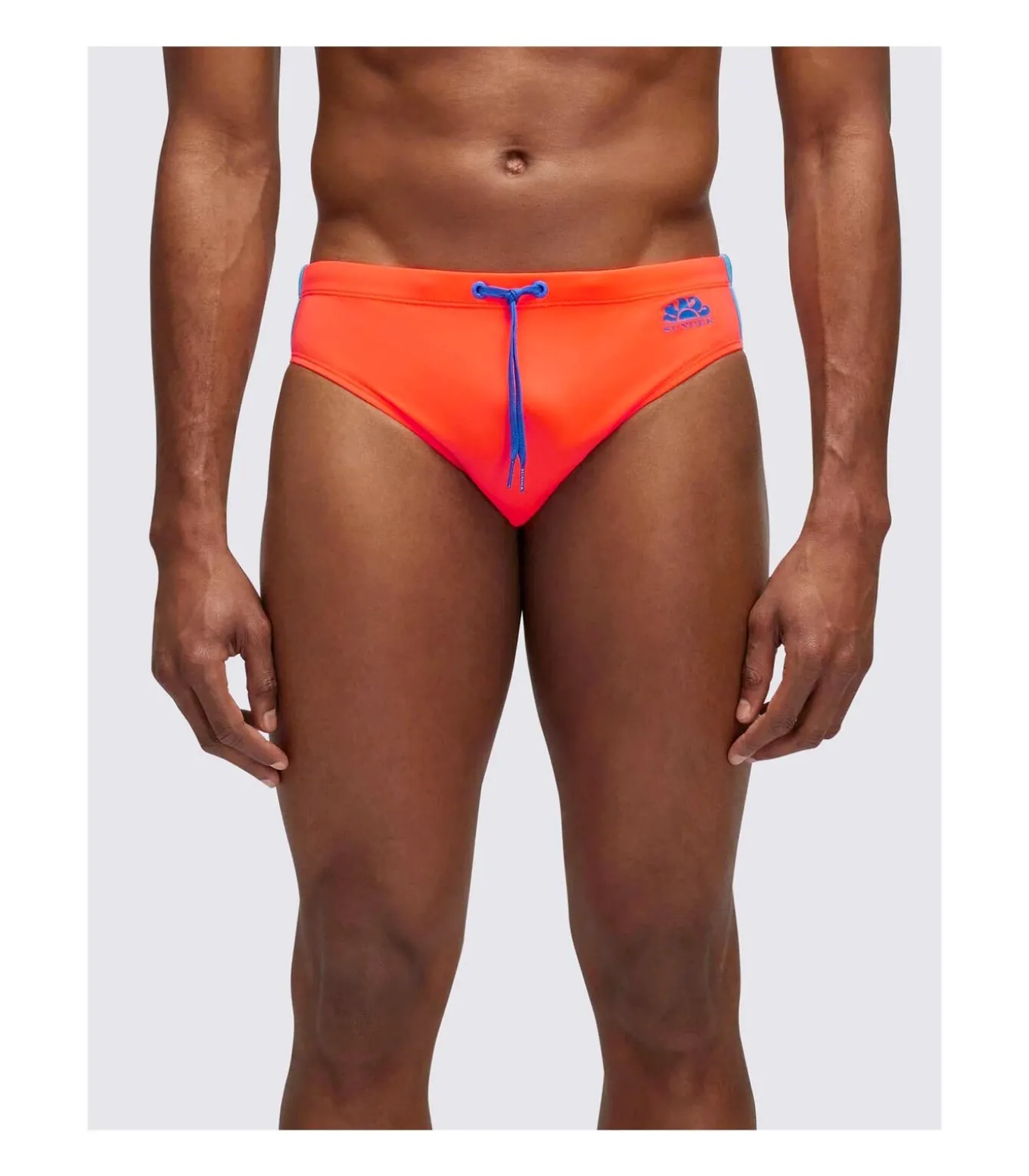Kleur: Fluo oranje Samenstelling: 78% polyamide, 22% elastaan Pasvorm: Strak Sluiting: Trekkoord in de taille Binnenkant: Gevoerd Details: Monochrome zwembroek met contrasterende driekleurige zijstrepen, Sundek–logo op de voorkant en rubberen patch op de achterkant. Elastische, stevige en sneldrogende stof Gebruik: Ideaal om te zwemmen, te trainen in het water of gewoon te ontspannen in de zon